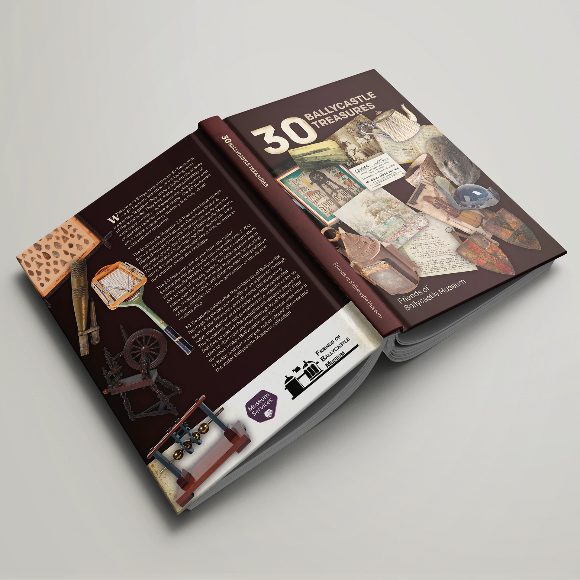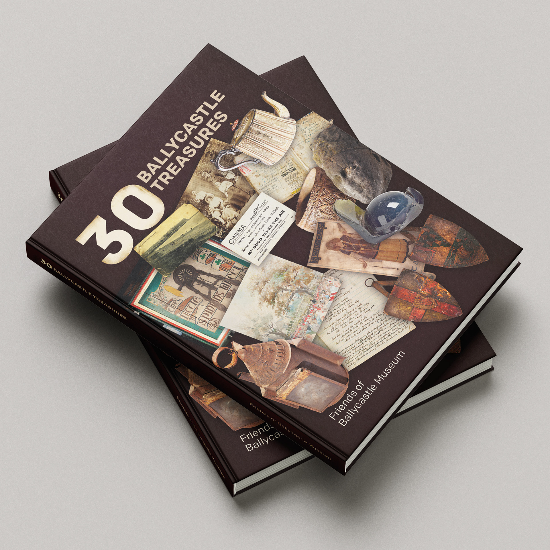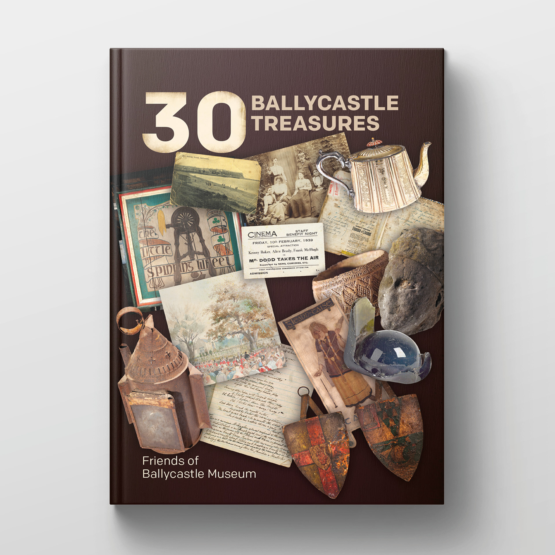 As the designer behind 30 Ballycastle Treasures, I had the privilege of bringing this rich tapestry of local history to life through a layout that balances heritage with modern accessibility. This book, edited by Aidan McMichael, showcases thirty unique objects from the Ballycastle Museum collection, many of which are usually tucked away in storage. From ancient flint arrowheads and the medieval Bonamargy Manuscript to quirky items like a vintage tennis racquet and a “trench art” brass lighter, each page tells a story of the community’s “ups and downs” throughout the ages.