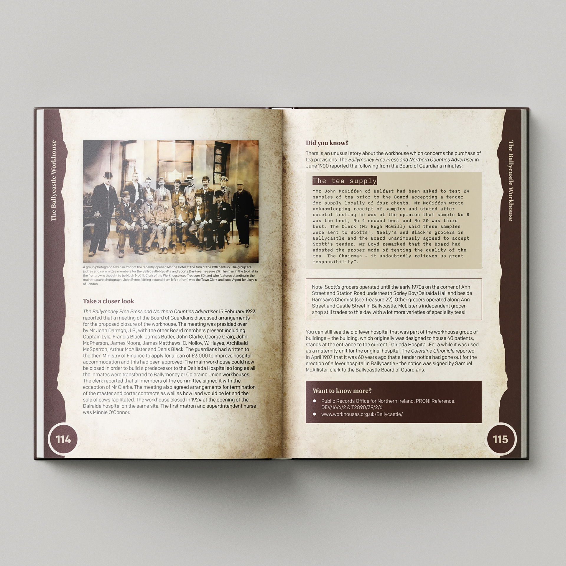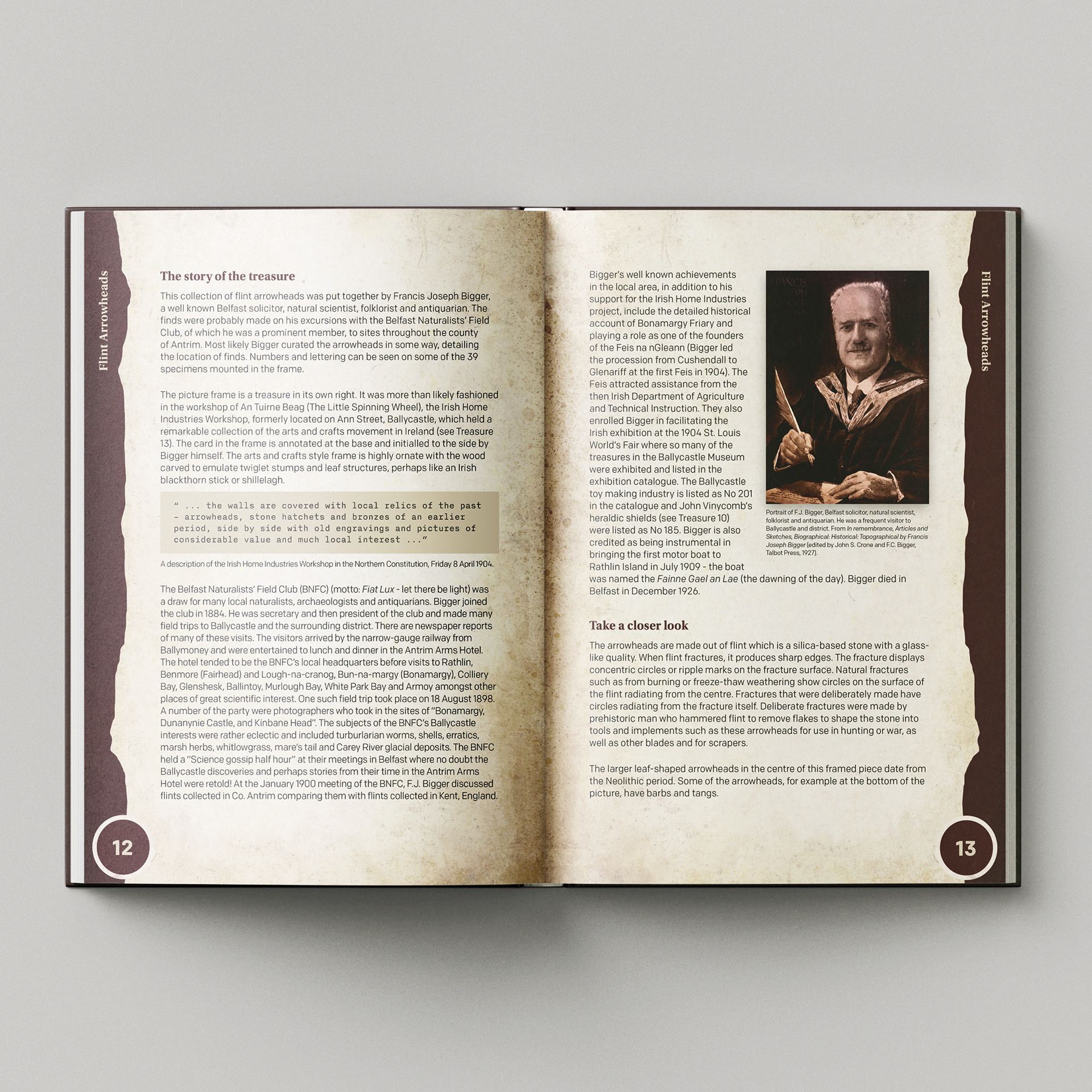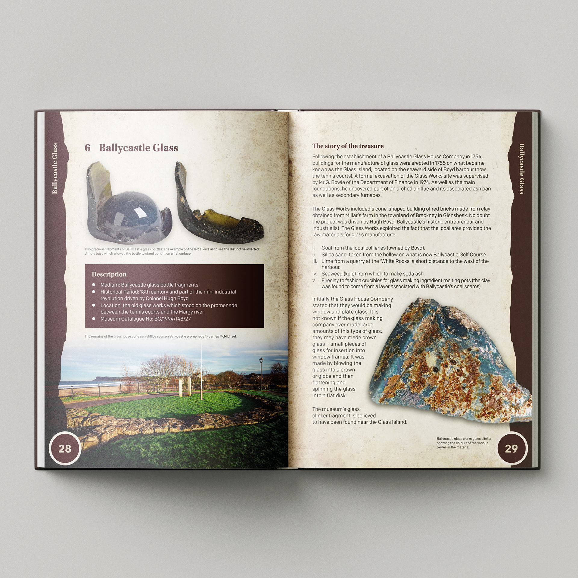 As the designer behind 30 Ballycastle Treasures, I had the privilege of bringing this rich tapestry of local history to life through a layout that balances heritage with modern accessibility. This book, edited by Aidan McMichael, showcases thirty unique objects from the Ballycastle Museum collection, many of which are usually tucked away in storage. From ancient flint arrowheads and the medieval Bonamargy Manuscript to quirky items like a vintage tennis racquet and a “trench art” brass lighter, each page tells a story of the community’s “ups and downs” throughout the ages.