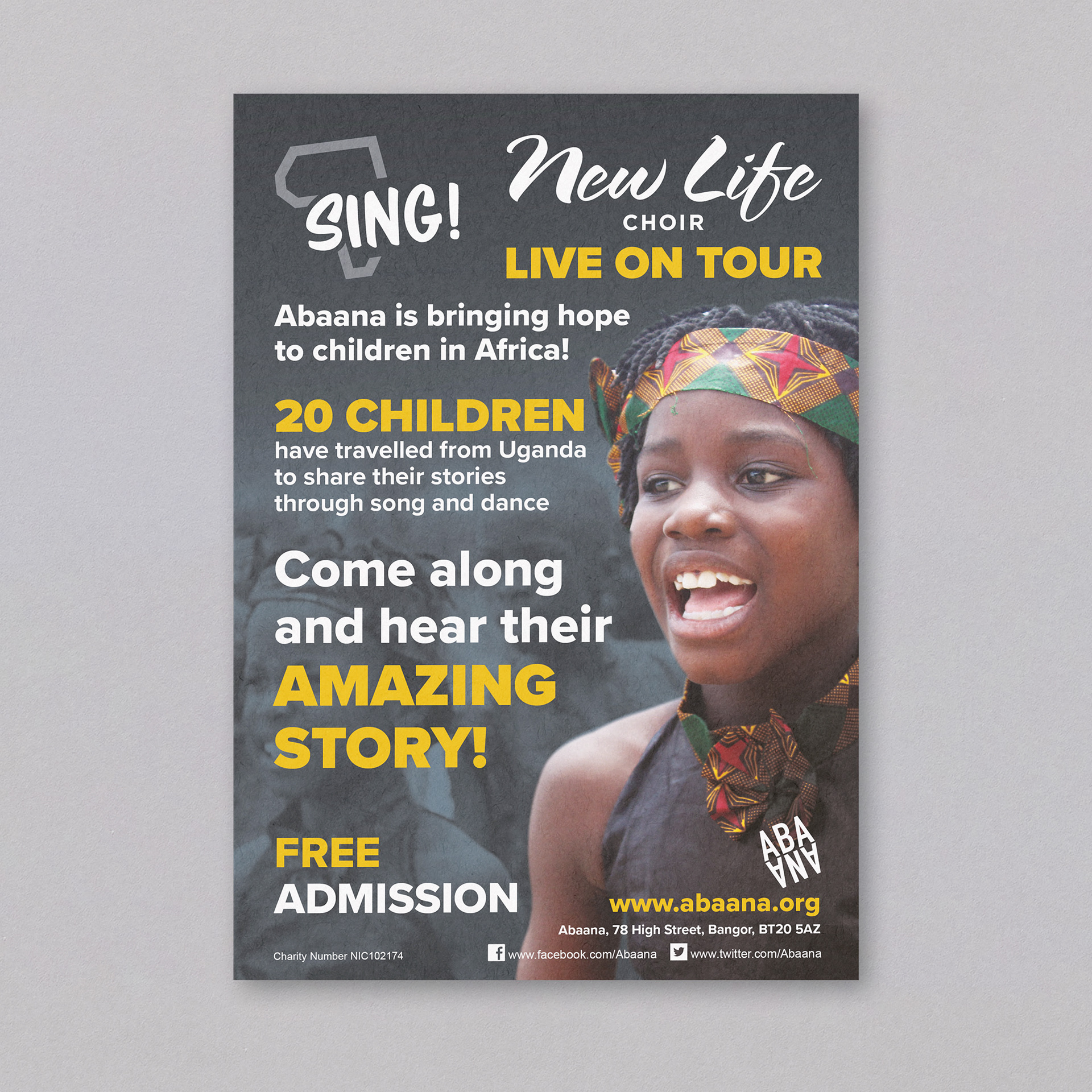 This poster was used in churches, schools, and community venues across Northern Ireland to promote free concerts and raise awareness of Abaana’s mission. It’s a celebration of resilience and connection, and a design that invites people to experience something truly meaningful.