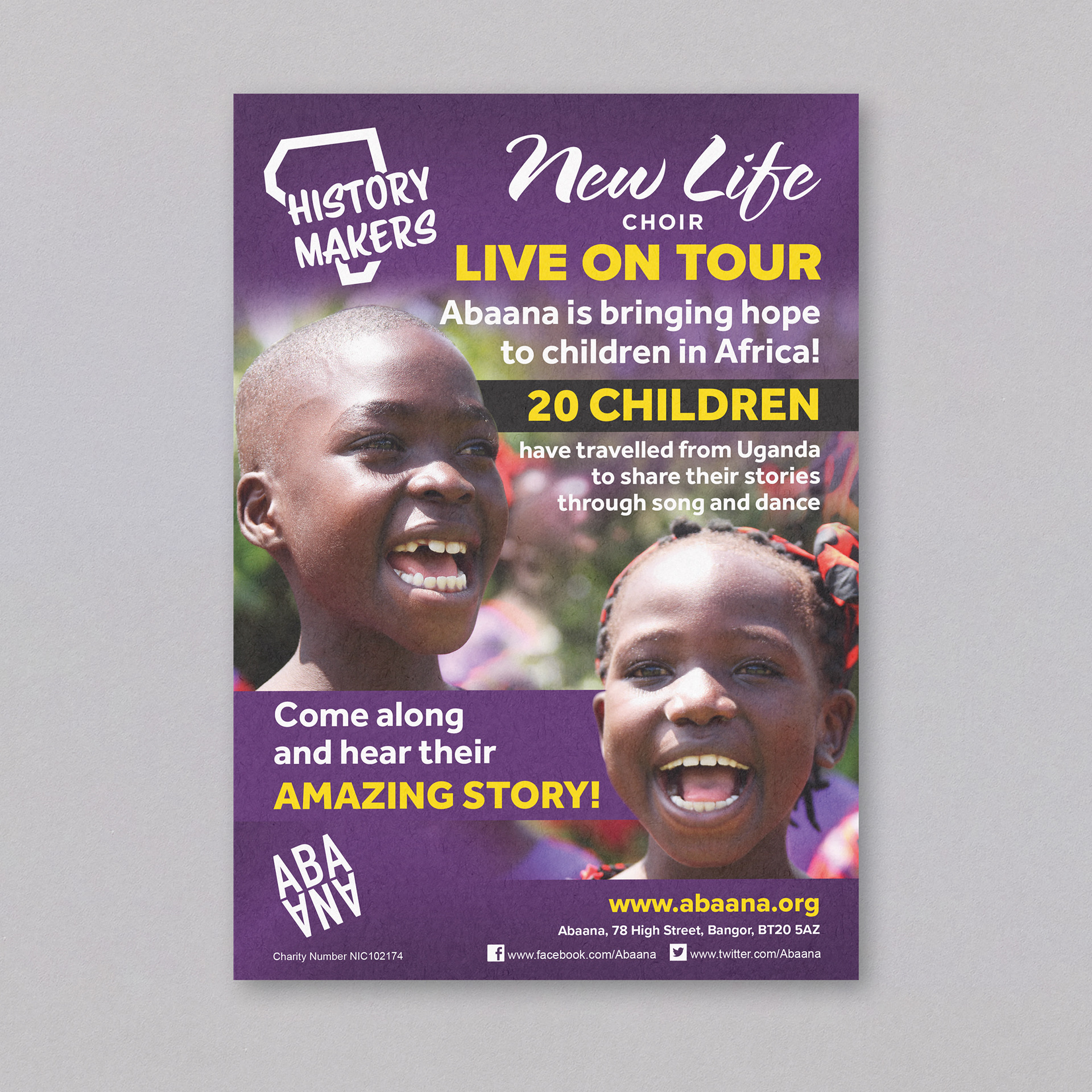 I designed this poster for Abaana’s New Life Choir tour titled History Makers, aiming to capture the joy, hope, and cultural richness of the event. Featuring two smiling children dressed in vibrant Ugandan attire, the design reflects the spirit of the tour, 20 children sharing their stories through song and dance.