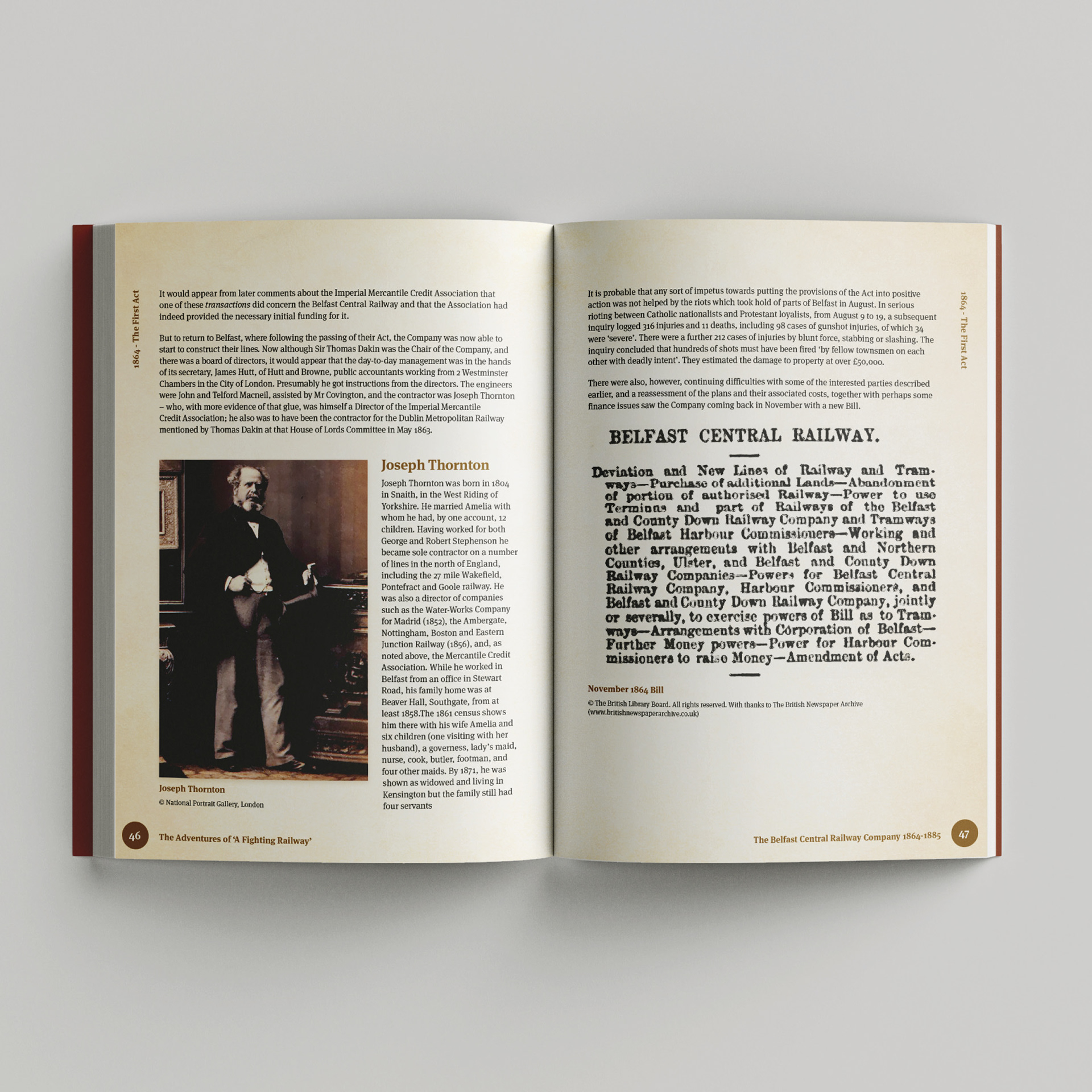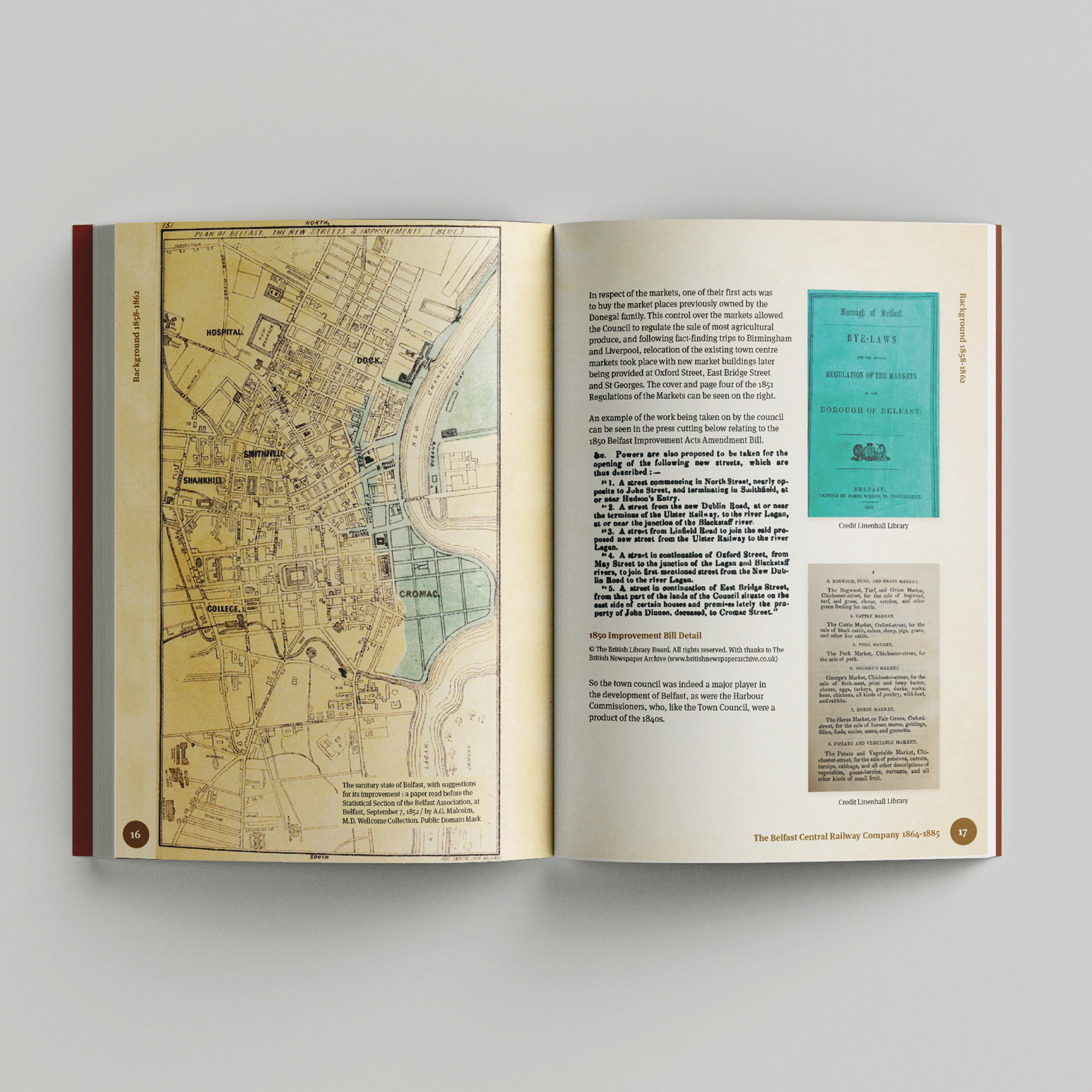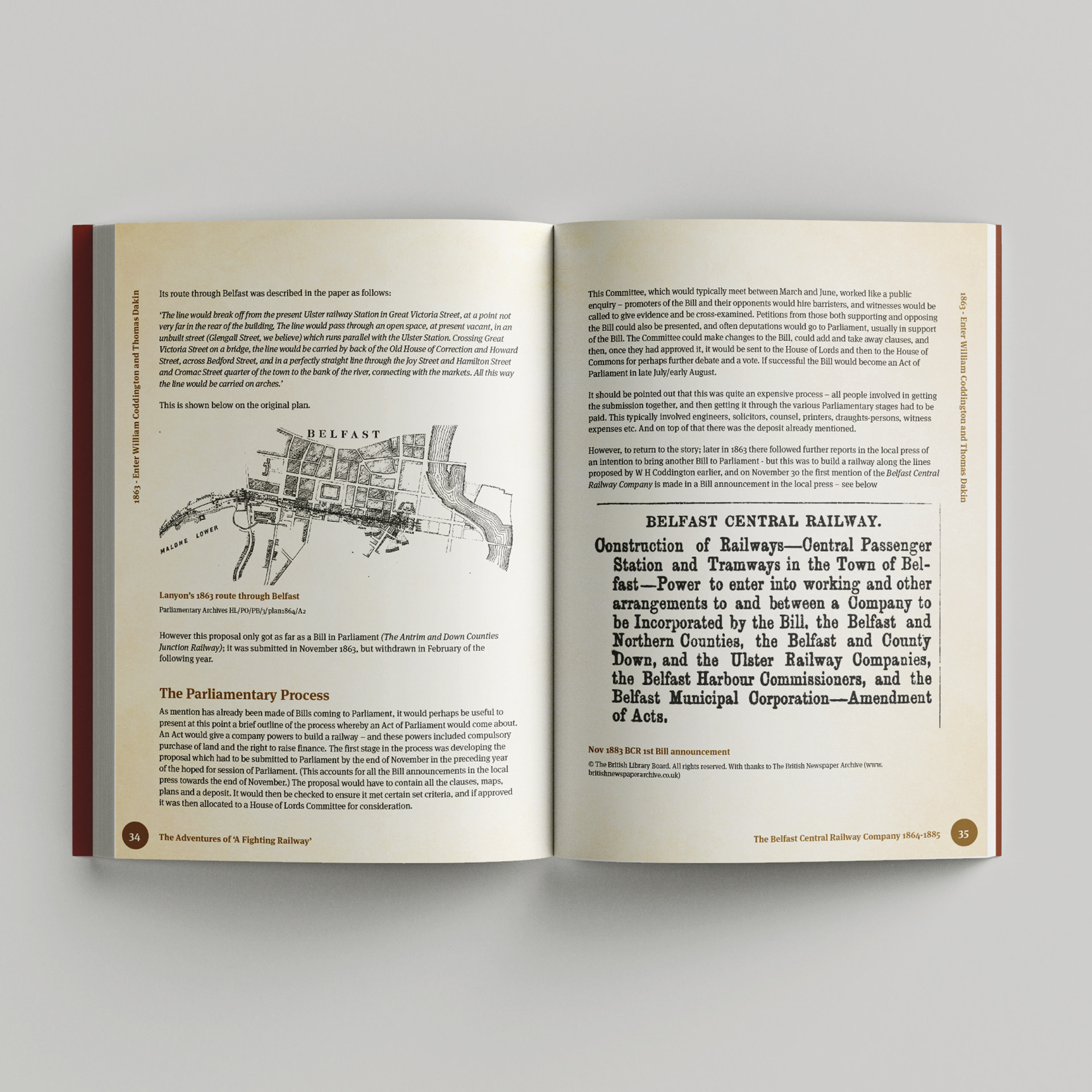 As the designer of The Adventures of ‘A Fighting Railway’, I had the privilege of bringing the turbulent history of the Belfast Central Railway (1864–1885) to life through visual storytelling. My work on this project involved crafting a layout that honours the book’s deep archival roots, incorporating intricate maps and rare historical imagery that document Belfast’s industrial golden age.
