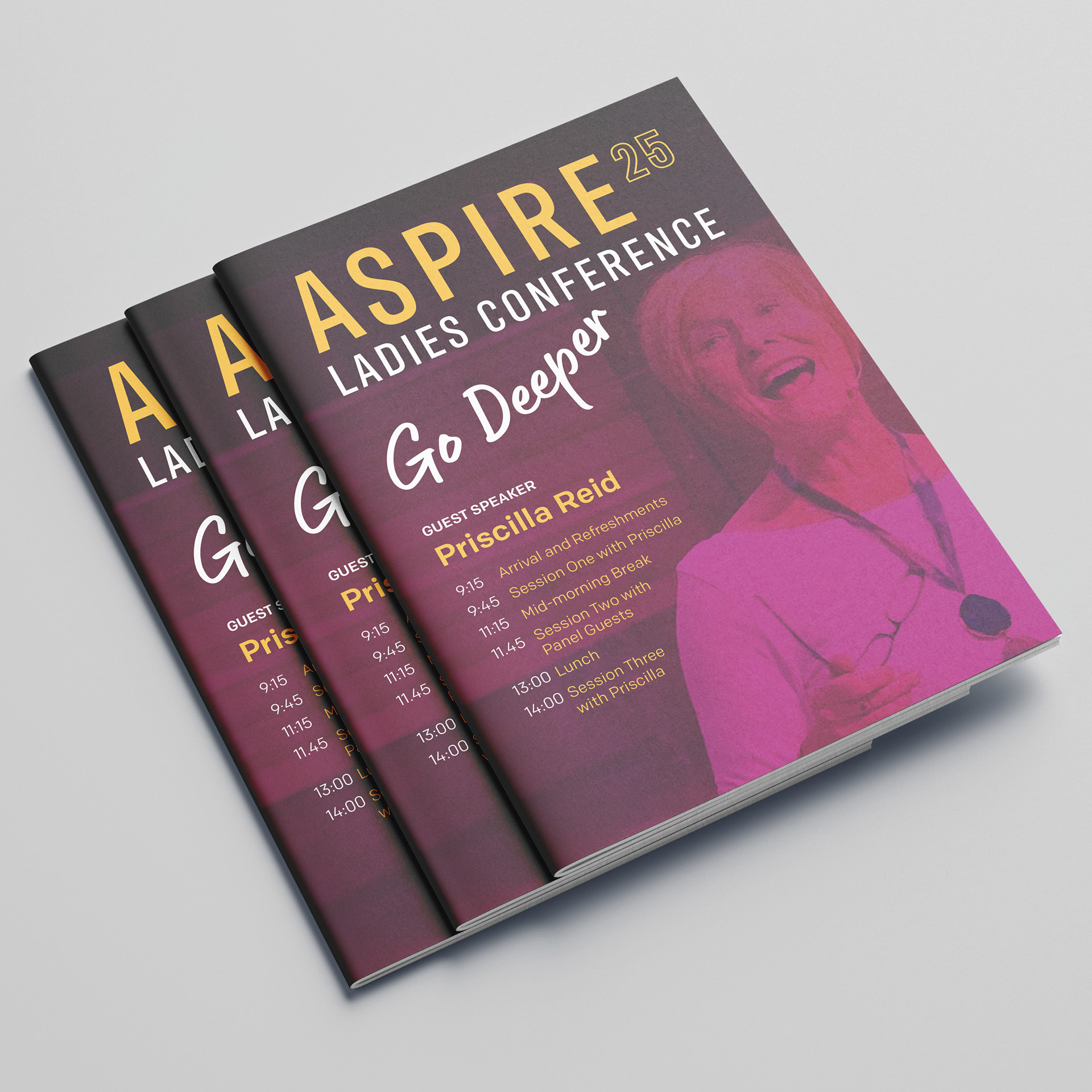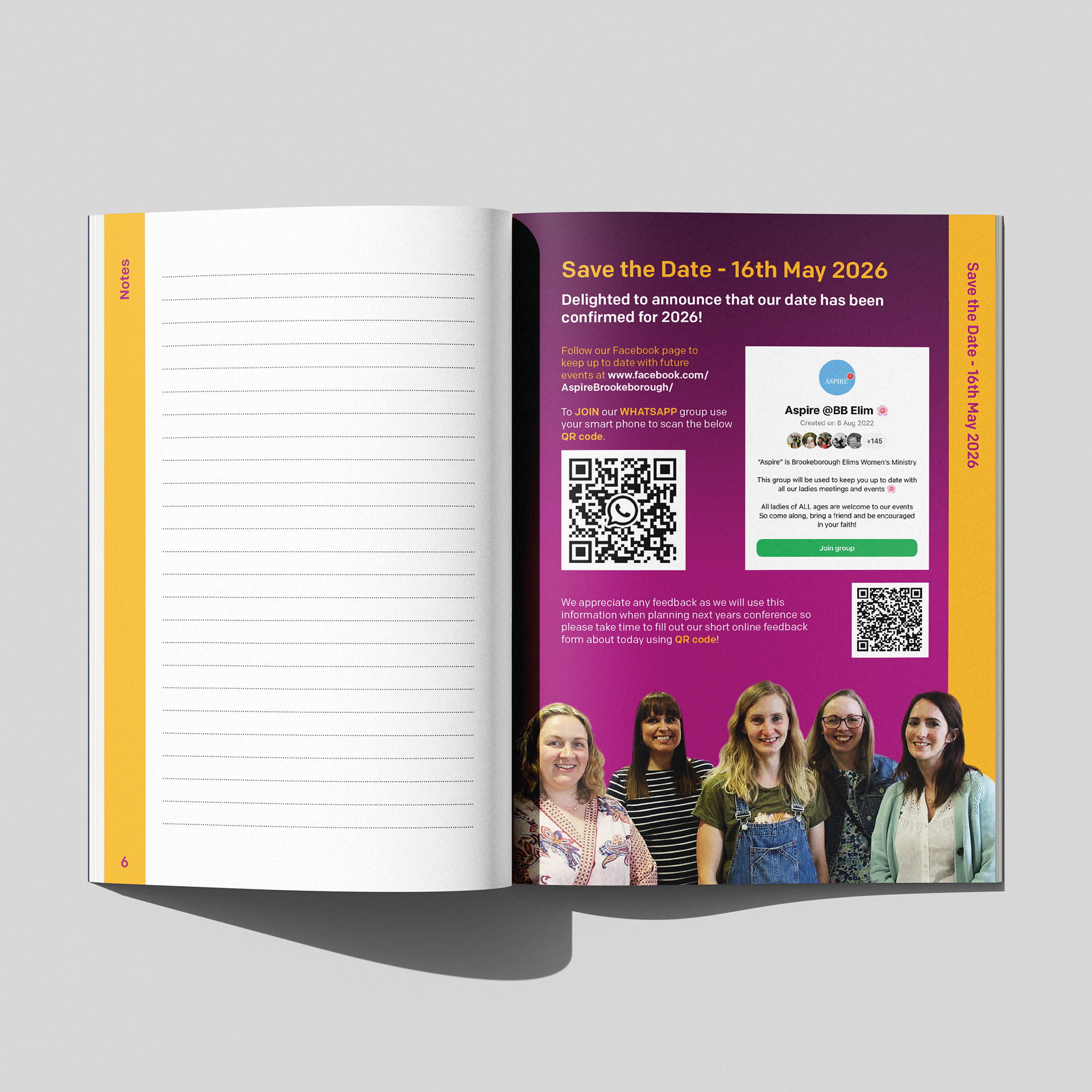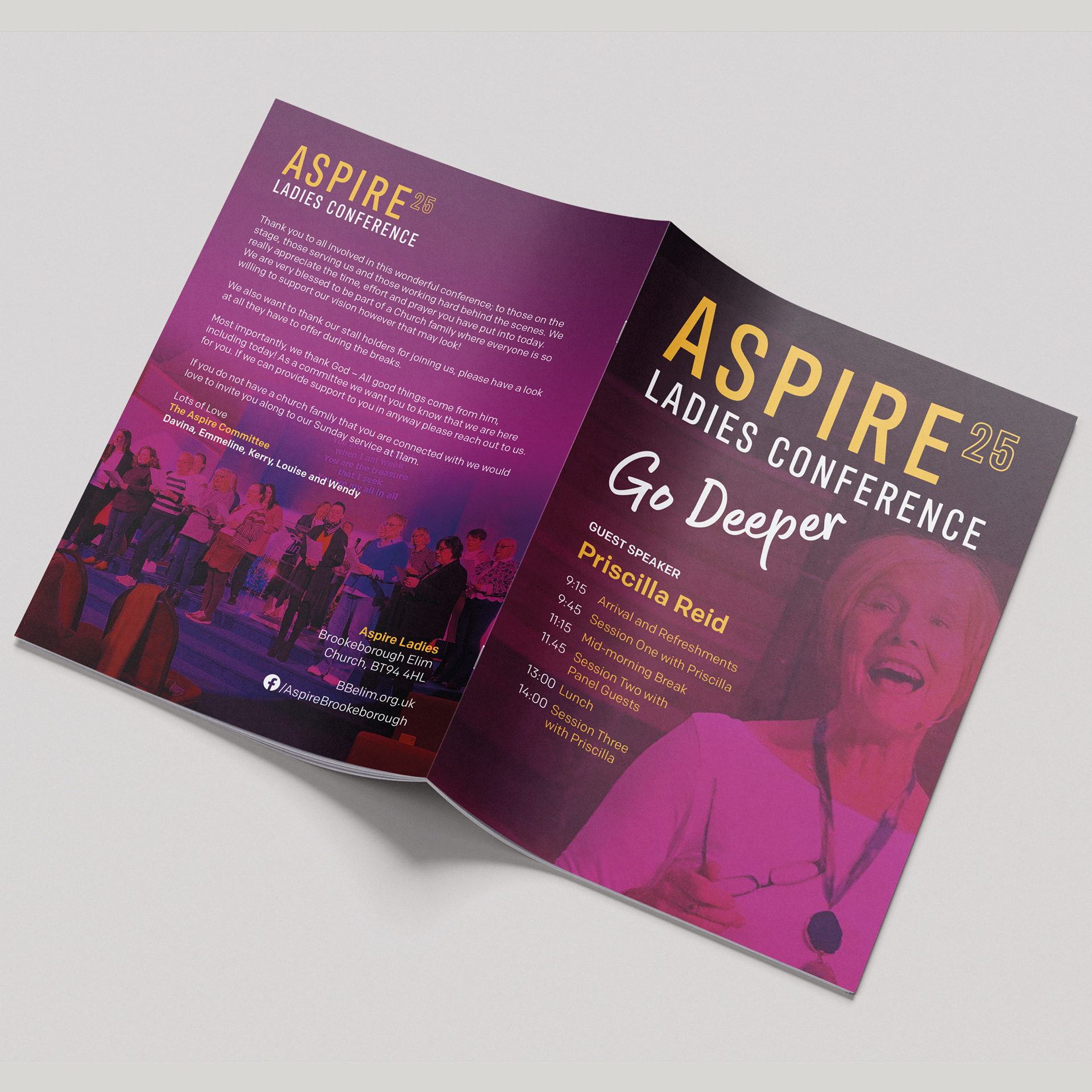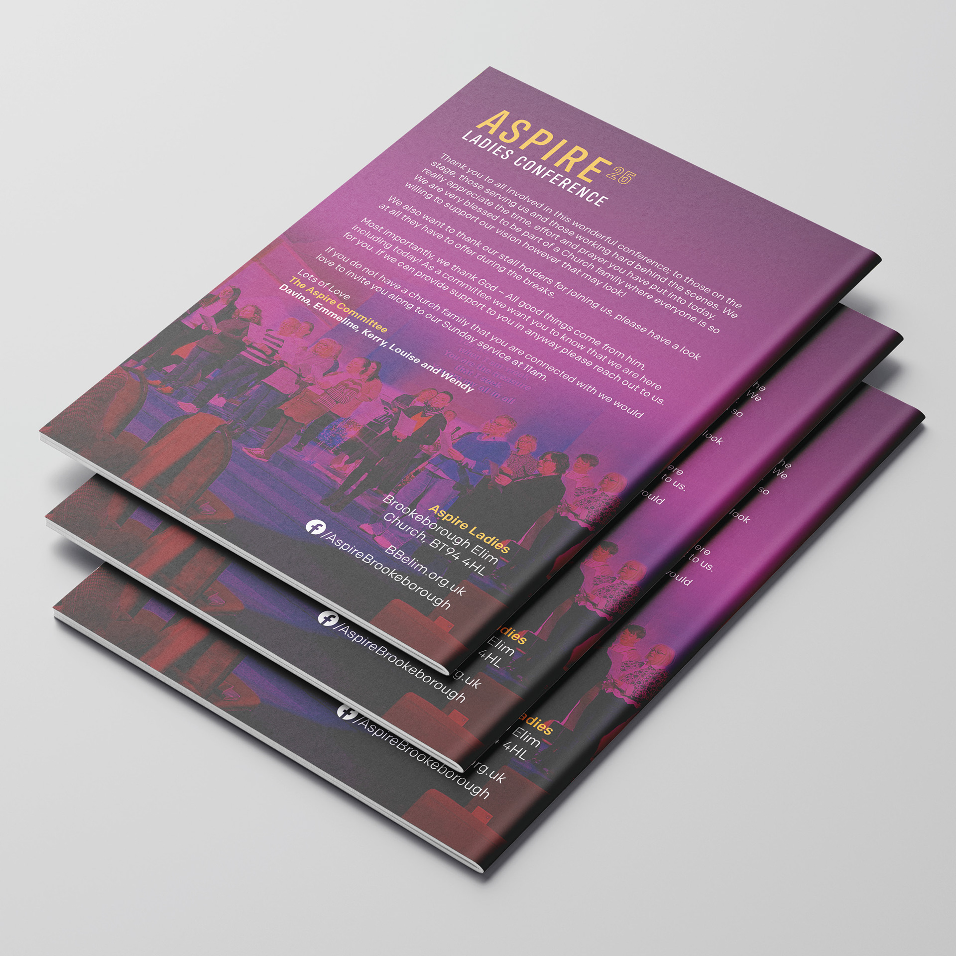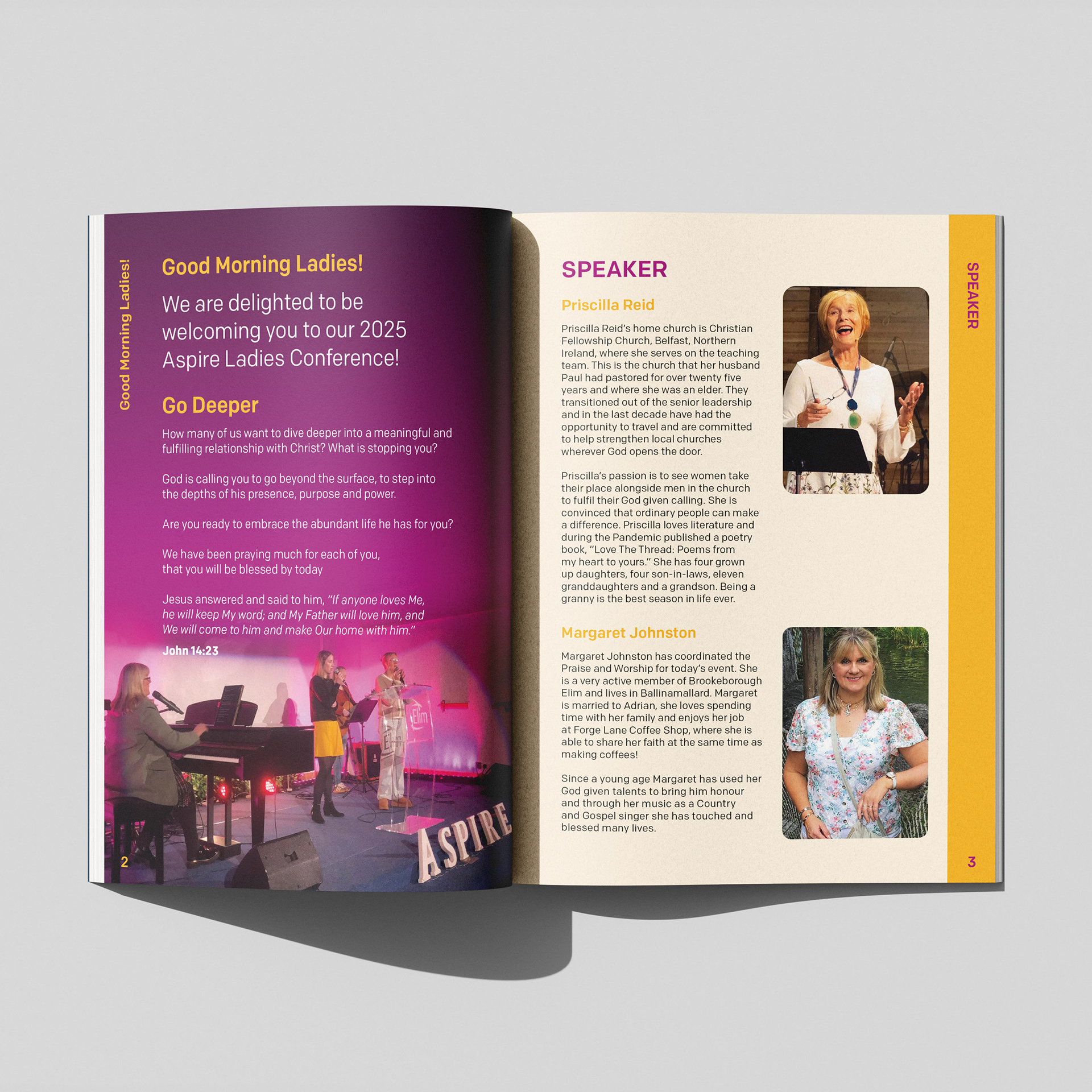 I designed and coordinated the production of the ASPIRE Ladies Conference booklet for Brookeborough Elim. The publication was created to give attendees clear access to key event information, including schedules, speaker profiles, and inspirational material.