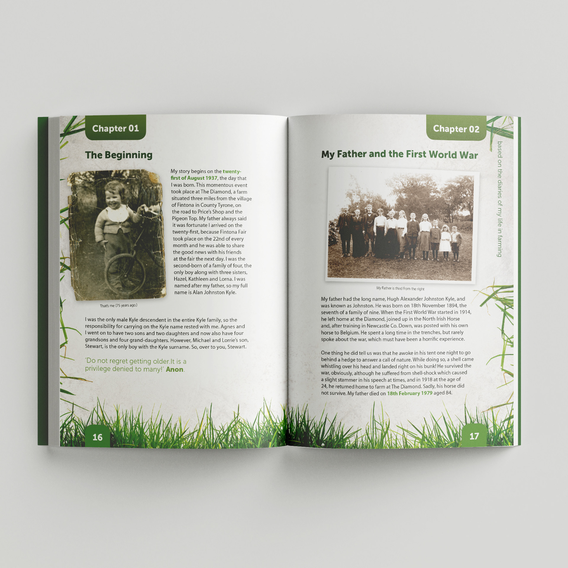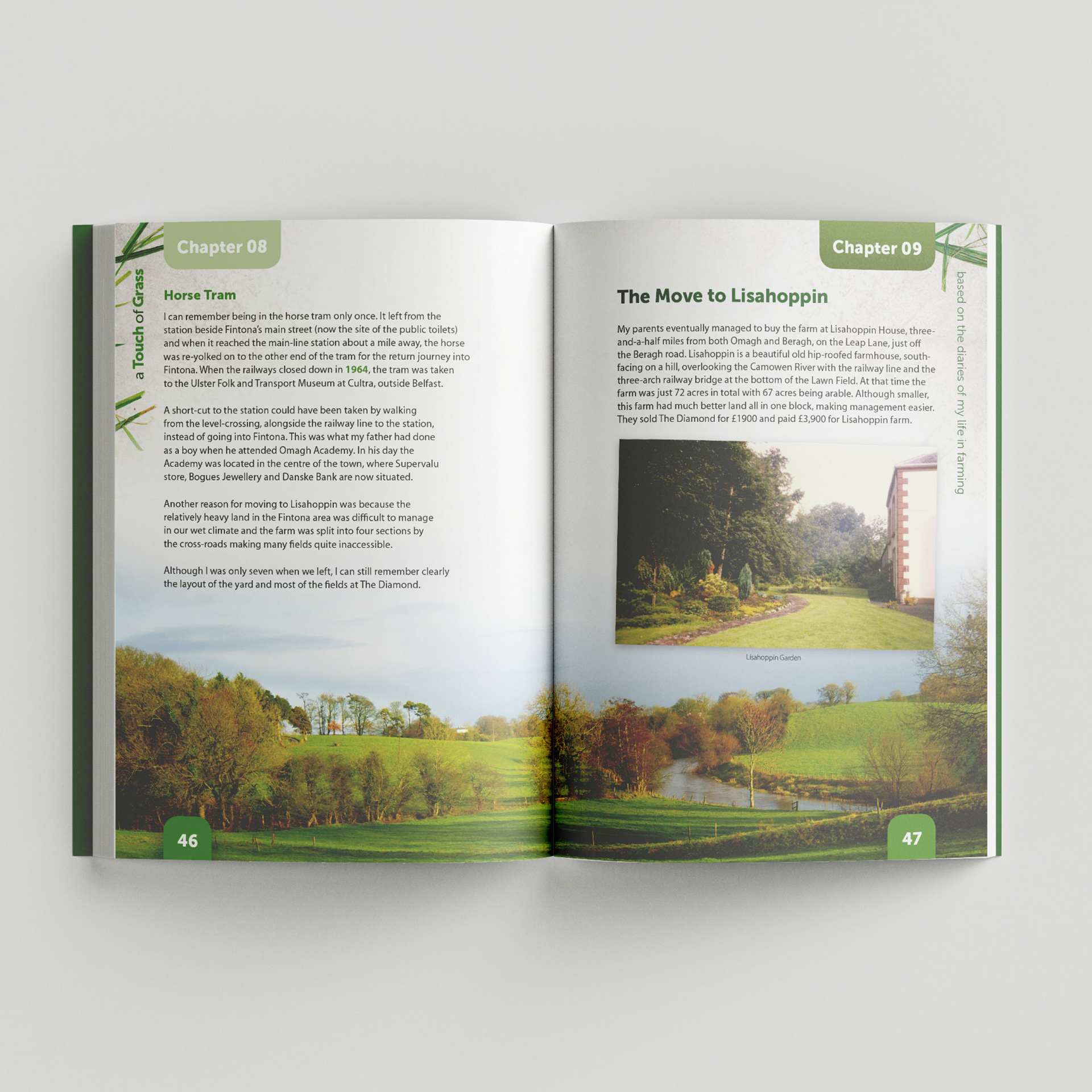 I was privileged to provide the graphic design and artwork for Alan Kyle’s memoir, A Touch of Grass. My goal was to create an attractive and professional layout that honors Alan’s fifty-year journey in Northern Ireland farming. The book is a fascinating historical record based on daily diaries Alan kept since age fifteen, documenting the evolution of agriculture from the 1940s at the Diamond, Fintona, to modern dairying at Lisahoppin. It captures the trials of “battling the elements,” the transition to low-cost, grass-based milk production, and personal family milestones.