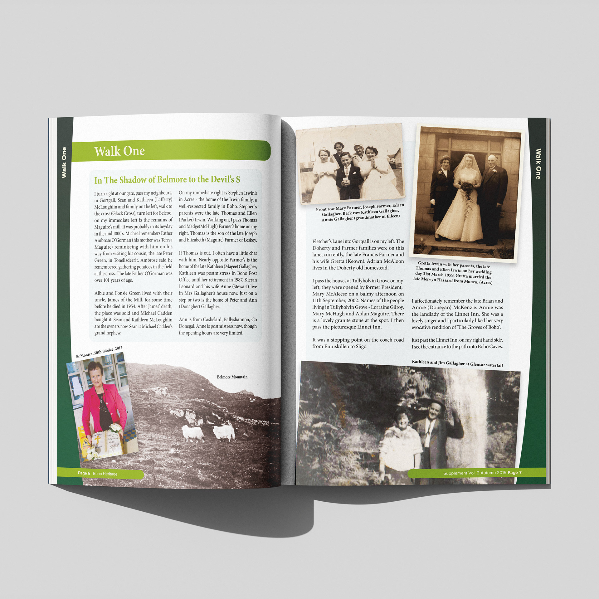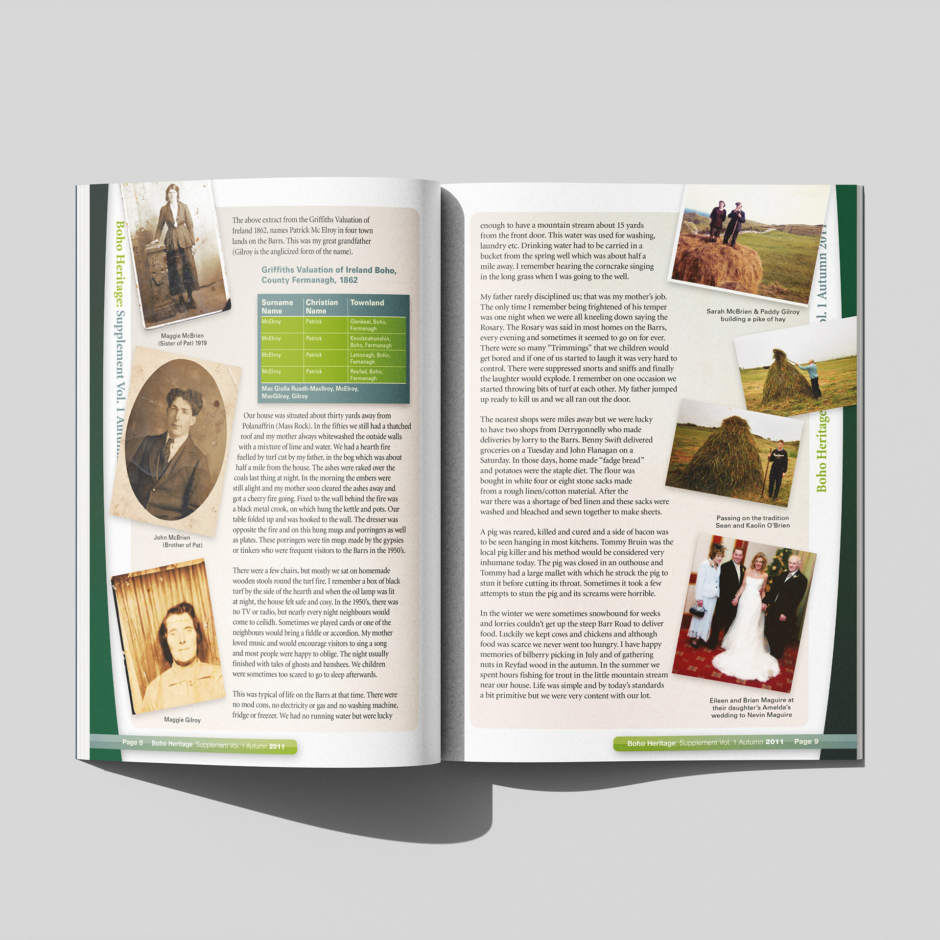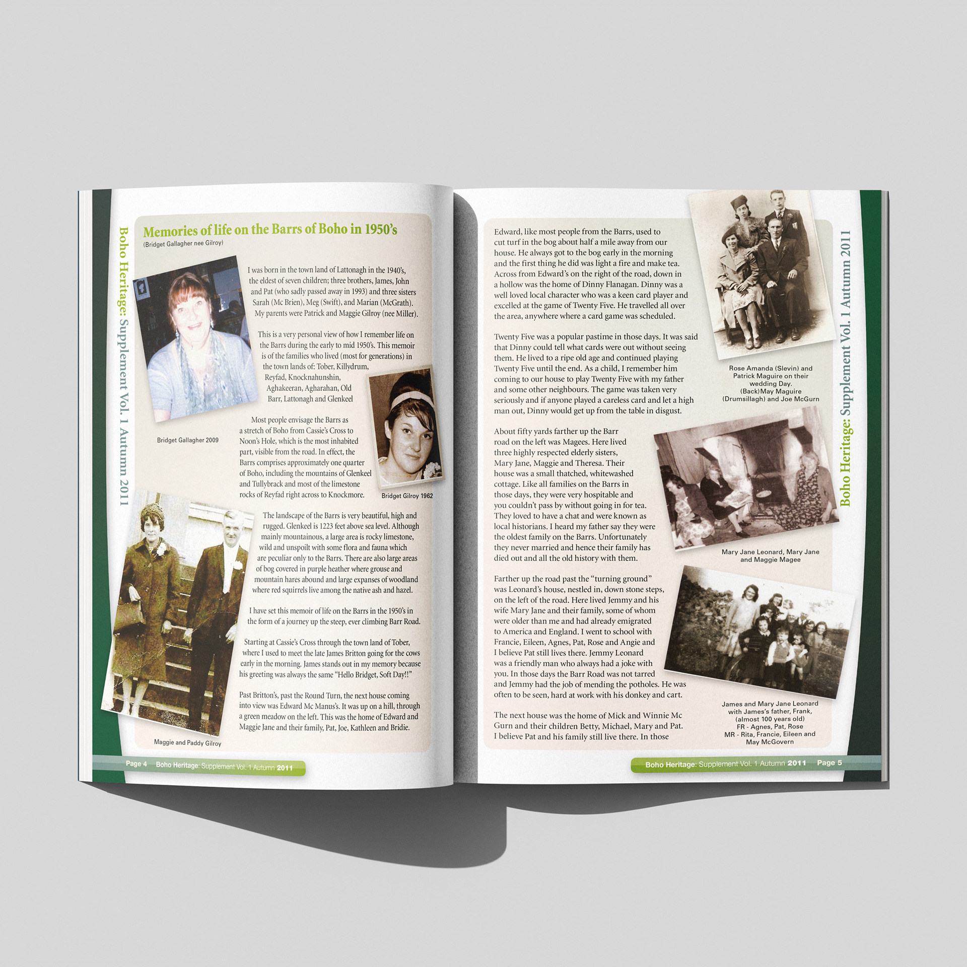 For Supplement Vol. 1, I worked closely with the committee to shape a visual language that felt warm, respectful, and rooted in the rural character of the area. The stories, from memories of life on the Barrs to accounts of Samsonagh School and the old traditions of the parish, carried a natural rhythm, and my design approach aimed to let those voices lead. Clean layouts, generous white space, and careful restoration of archival photographs helped create a publication that felt both contemporary and timeless.