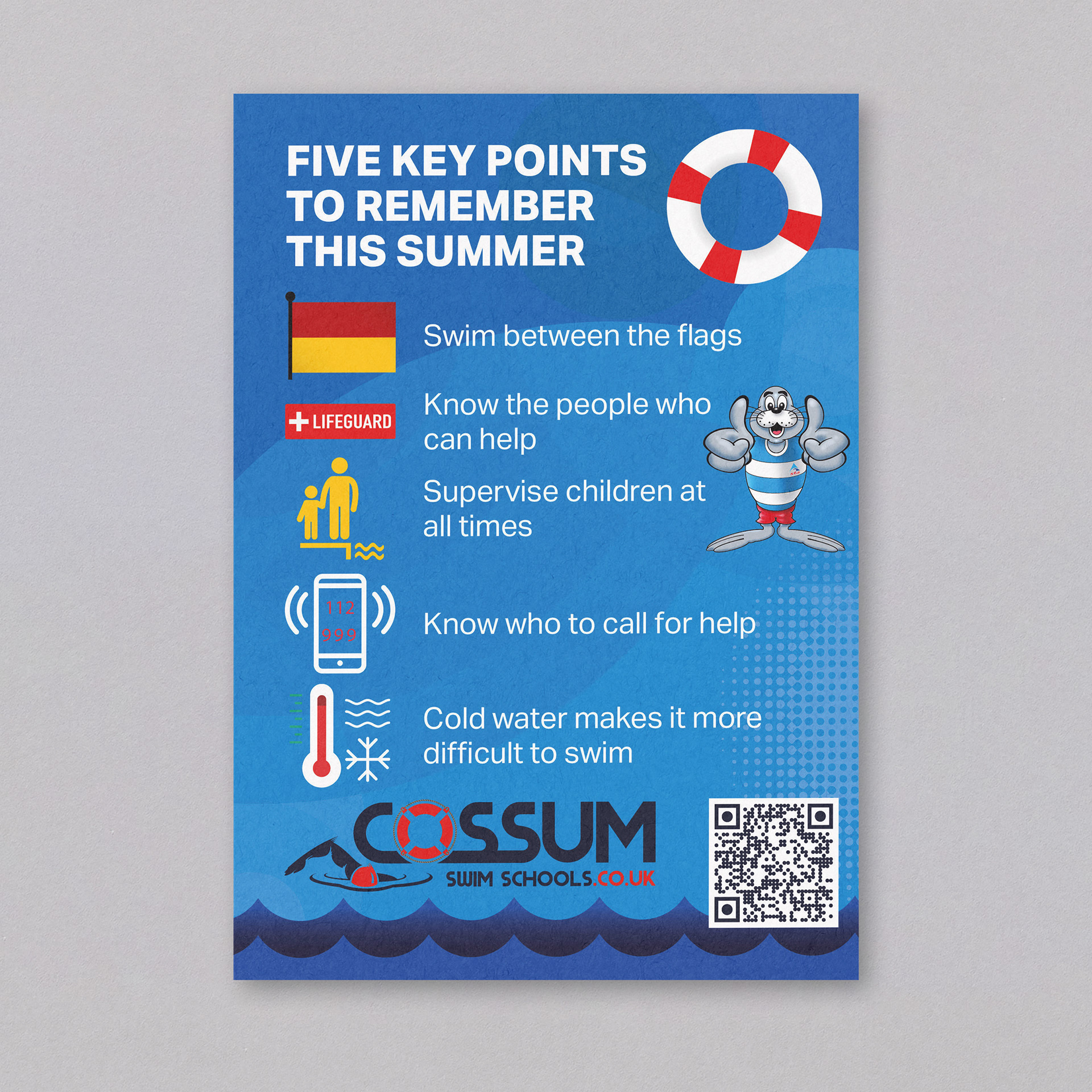 I designed this safety awareness poster for Cossum Swim Schools to promote essential summer swimming tips in a friendly and engaging way. Aimed at children and families, the layout uses bright colours, playful icons, and a cartoon seal to make the message approachable and memorable.