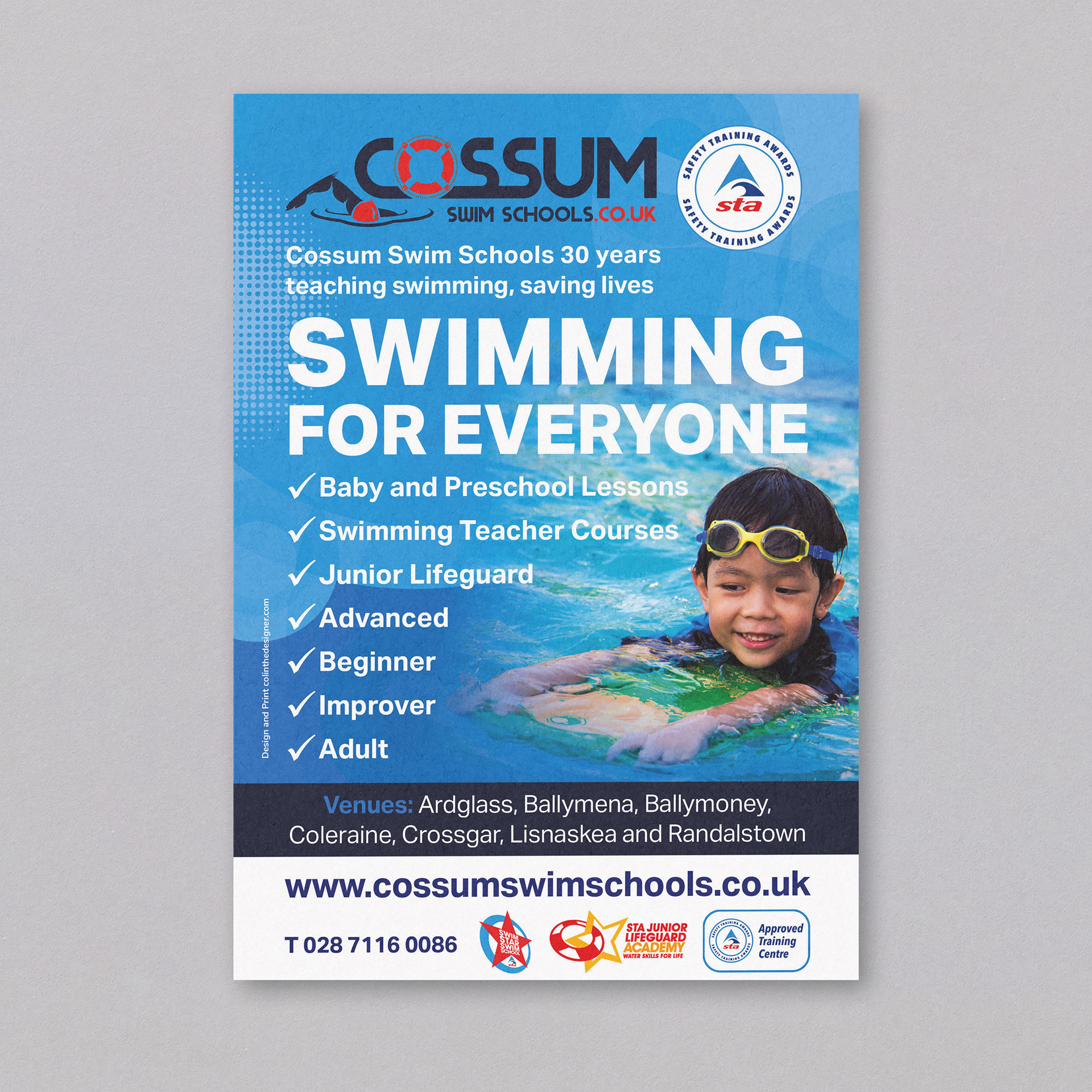 This poster was used across swim venues, schools, and community centres to support Cossum’s mission of saving lives through education and safe swimming practices.