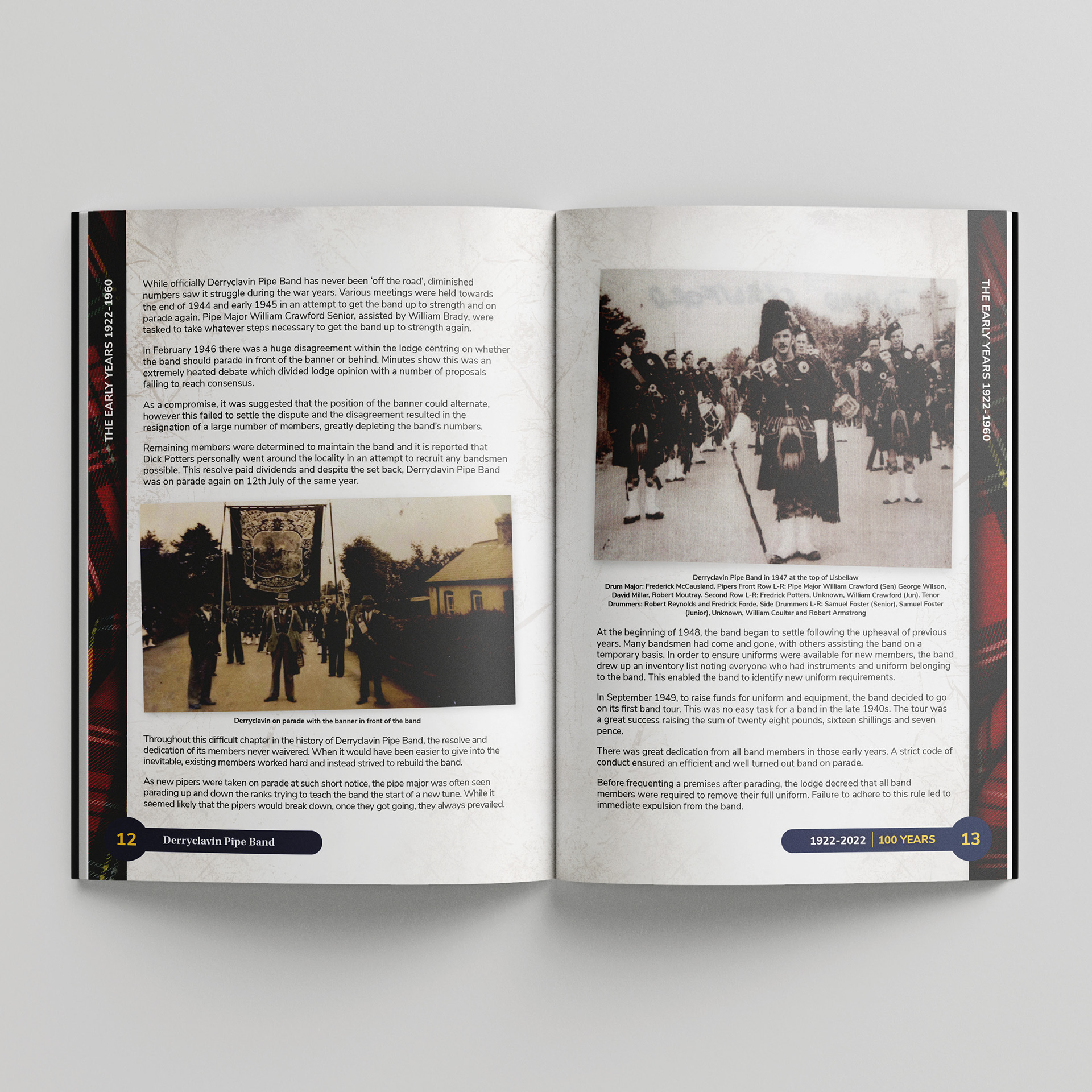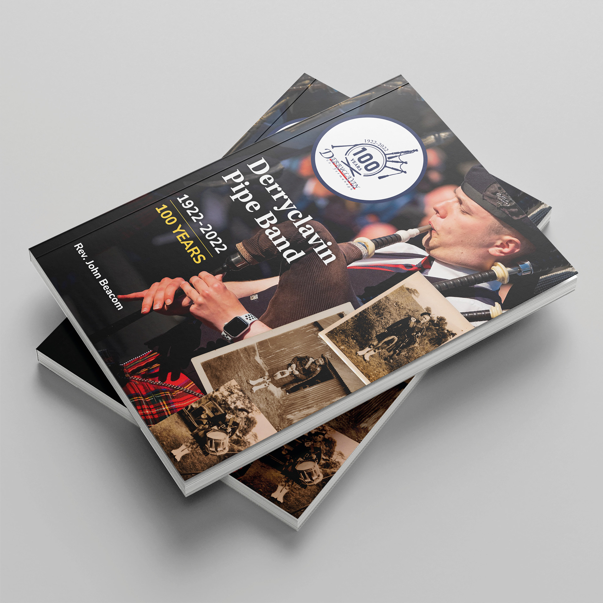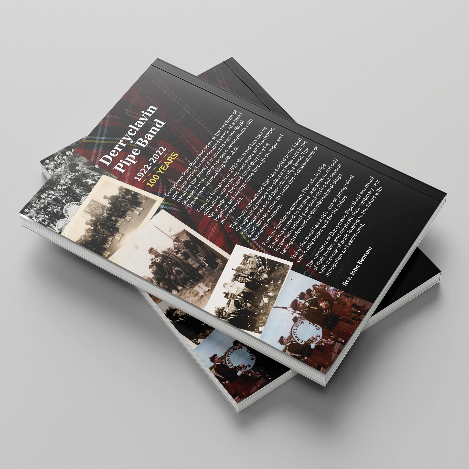 This book design showcases a clean, contemporary layout that highlights the heritage and community spirit of the Derryclavin Pipe Band.