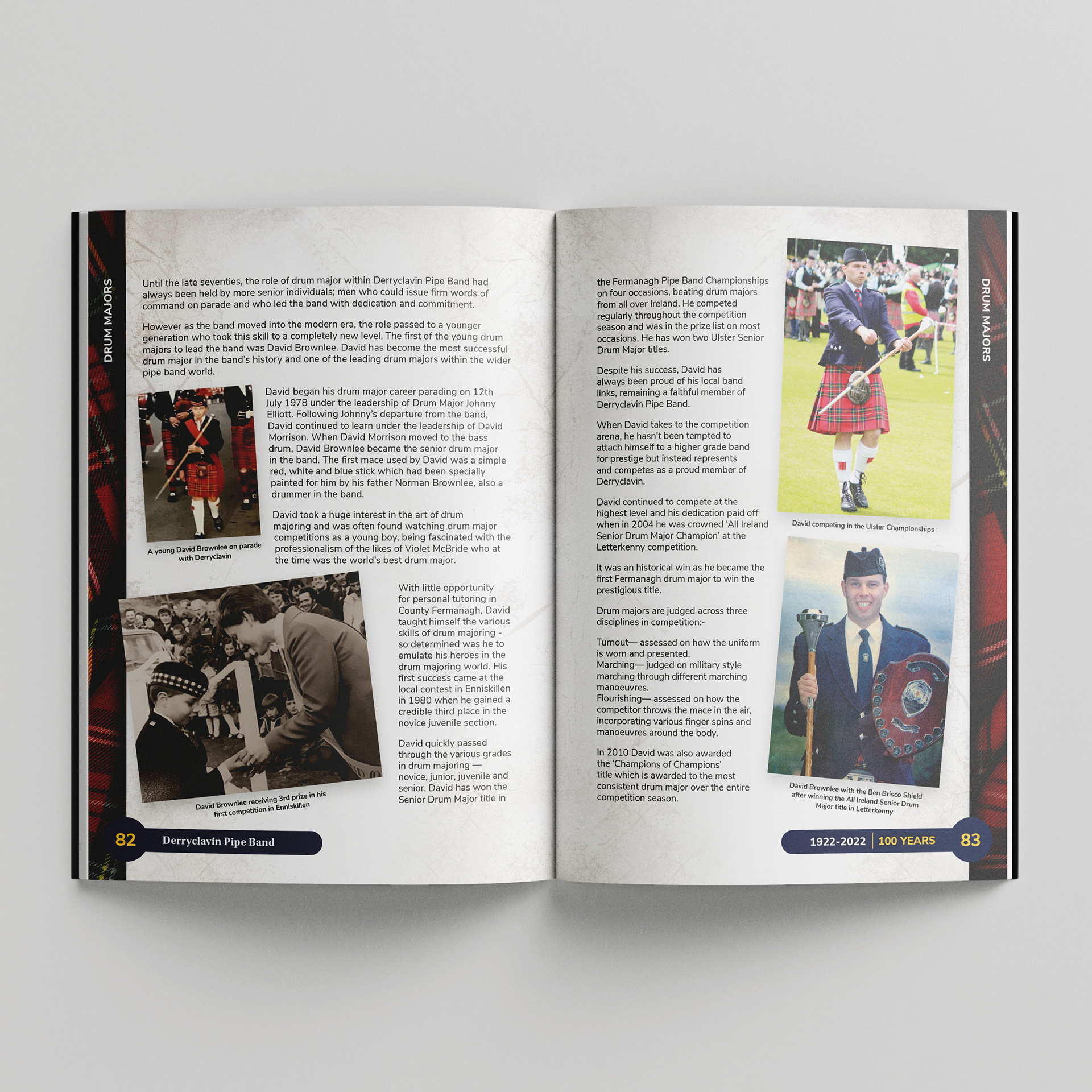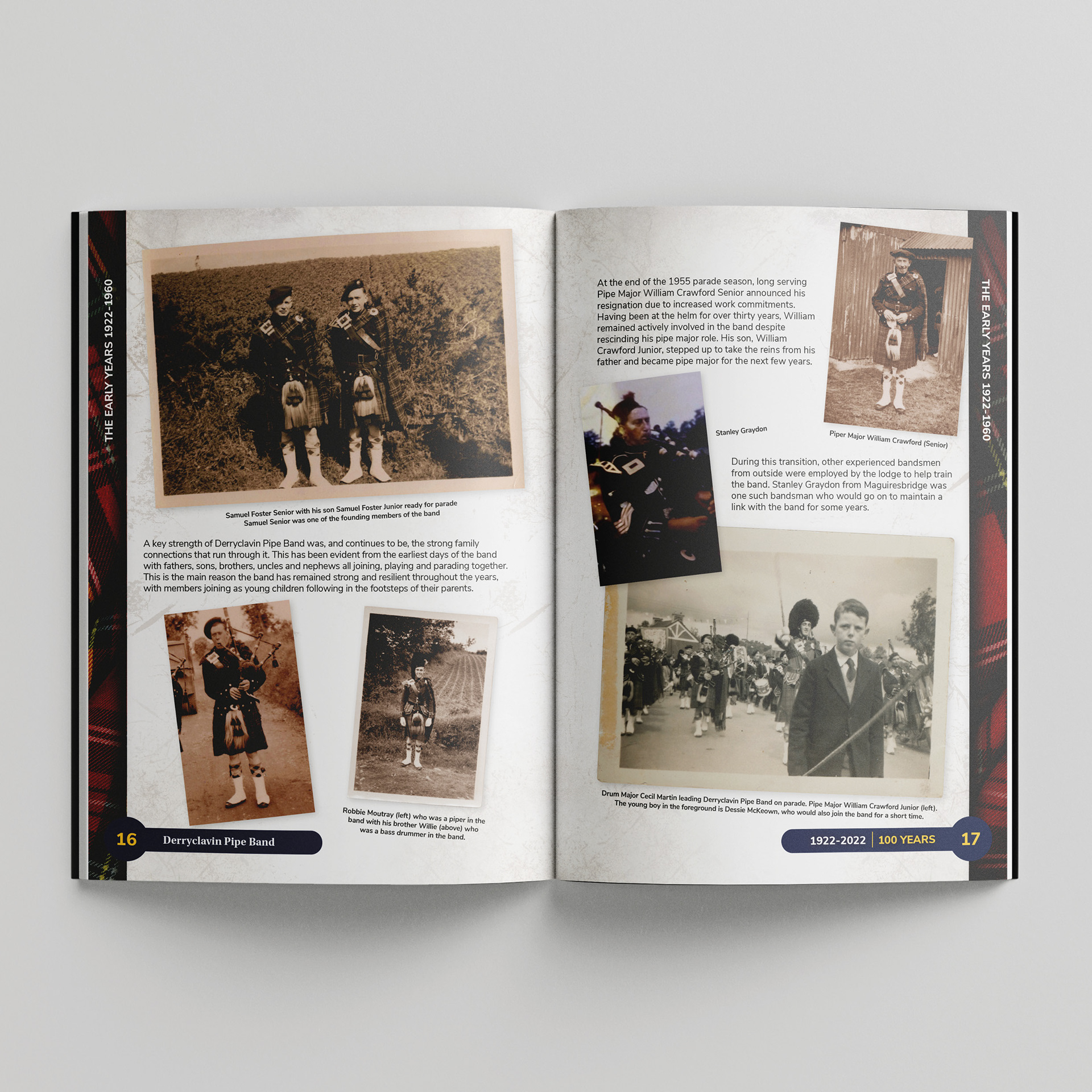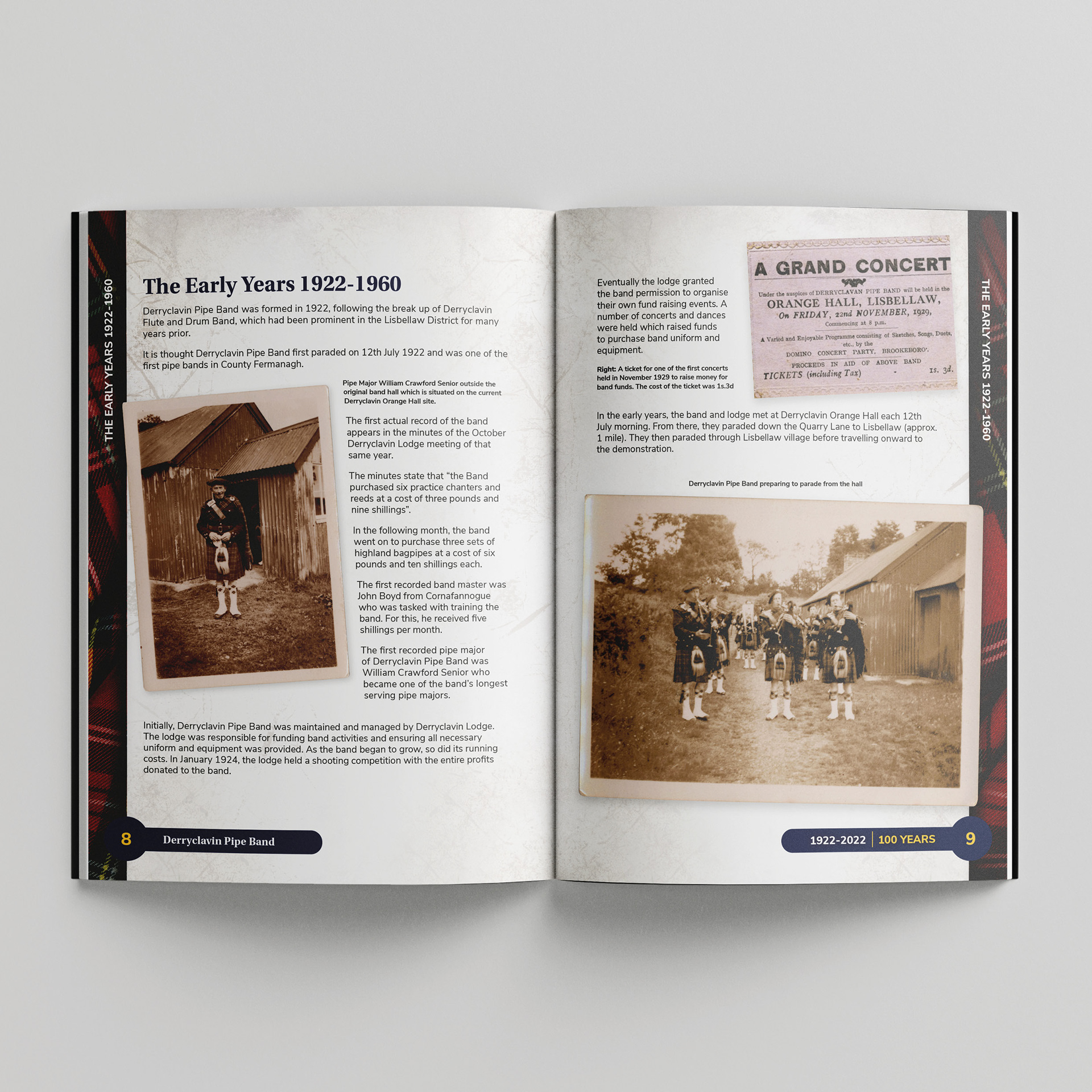 This book design showcases a clean, contemporary layout that highlights the heritage and community spirit of the Derryclavin Pipe Band.