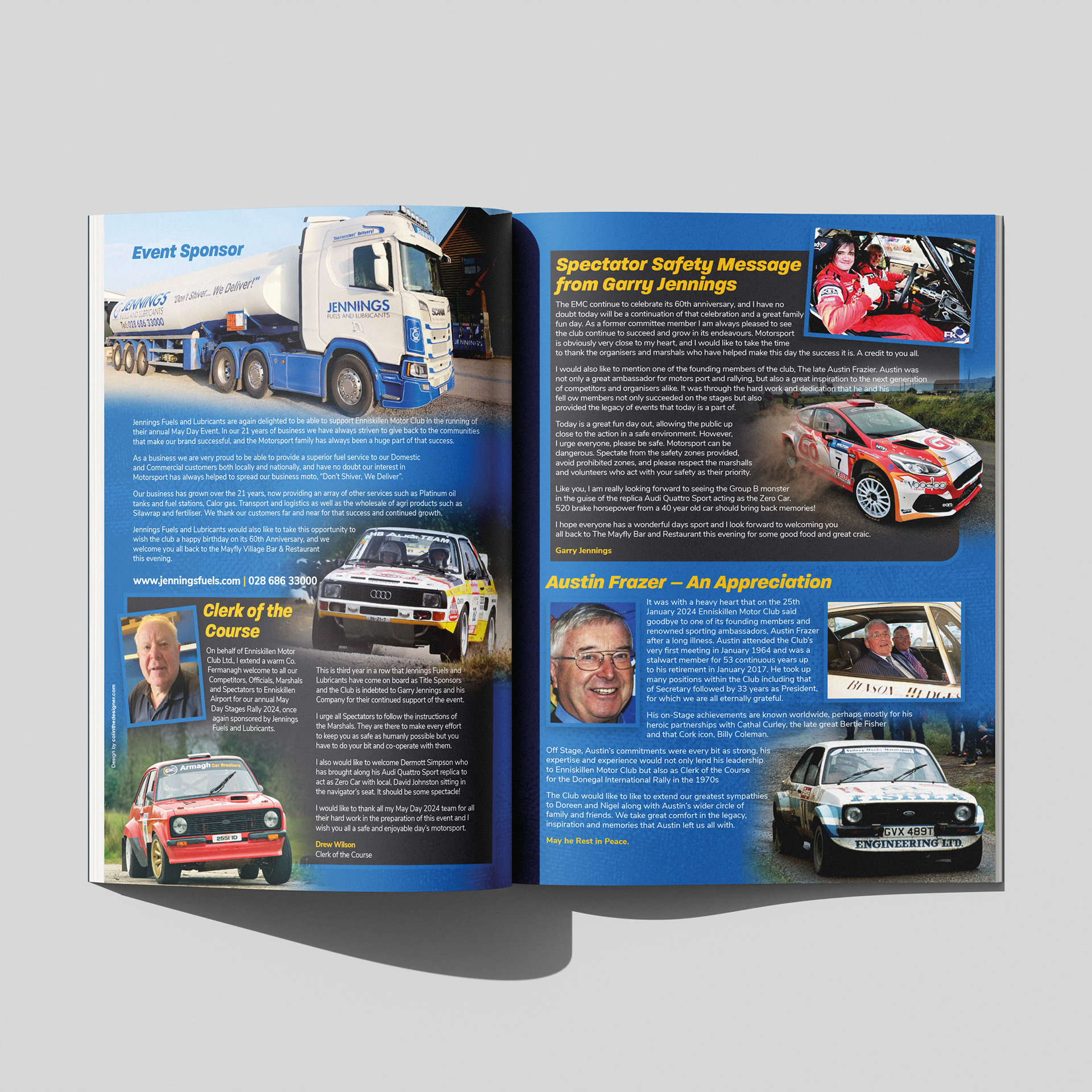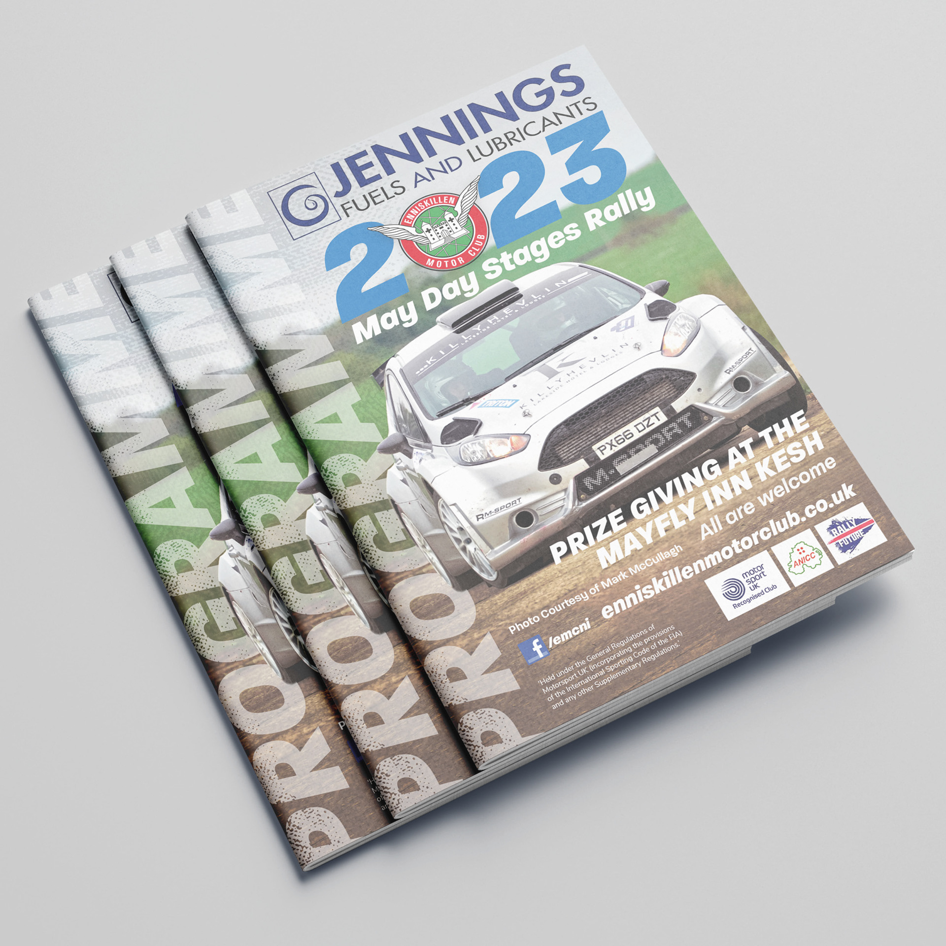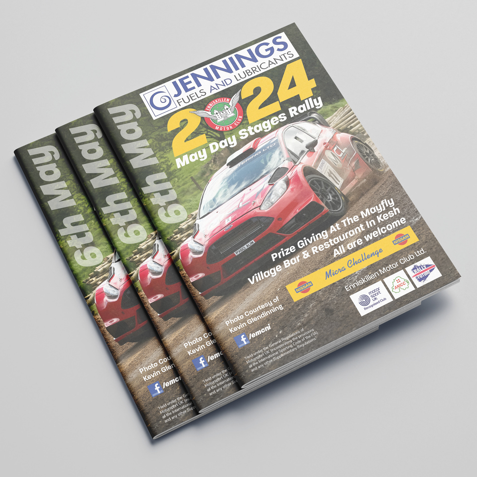 Working with Enniskillen Motor Club since 2014 has allowed me to build a deep understanding of the club’s heritage, professionalism, and the unique energy surrounding its events. That long‑standing collaboration shaped the design approach behind the 2024, 2023, and 2022 May Day Stages Rally booklets, each one refining how information and visual storytelling come together.