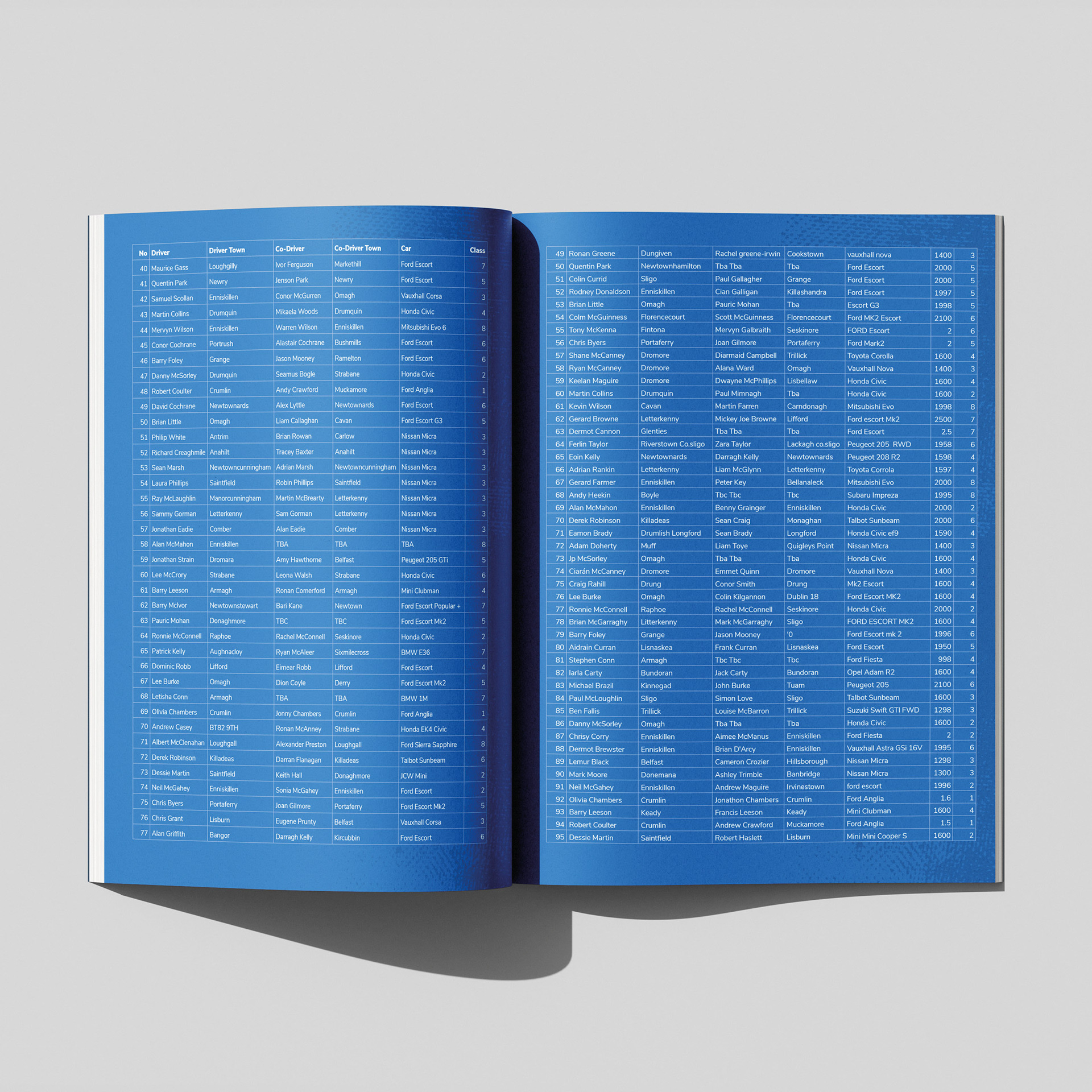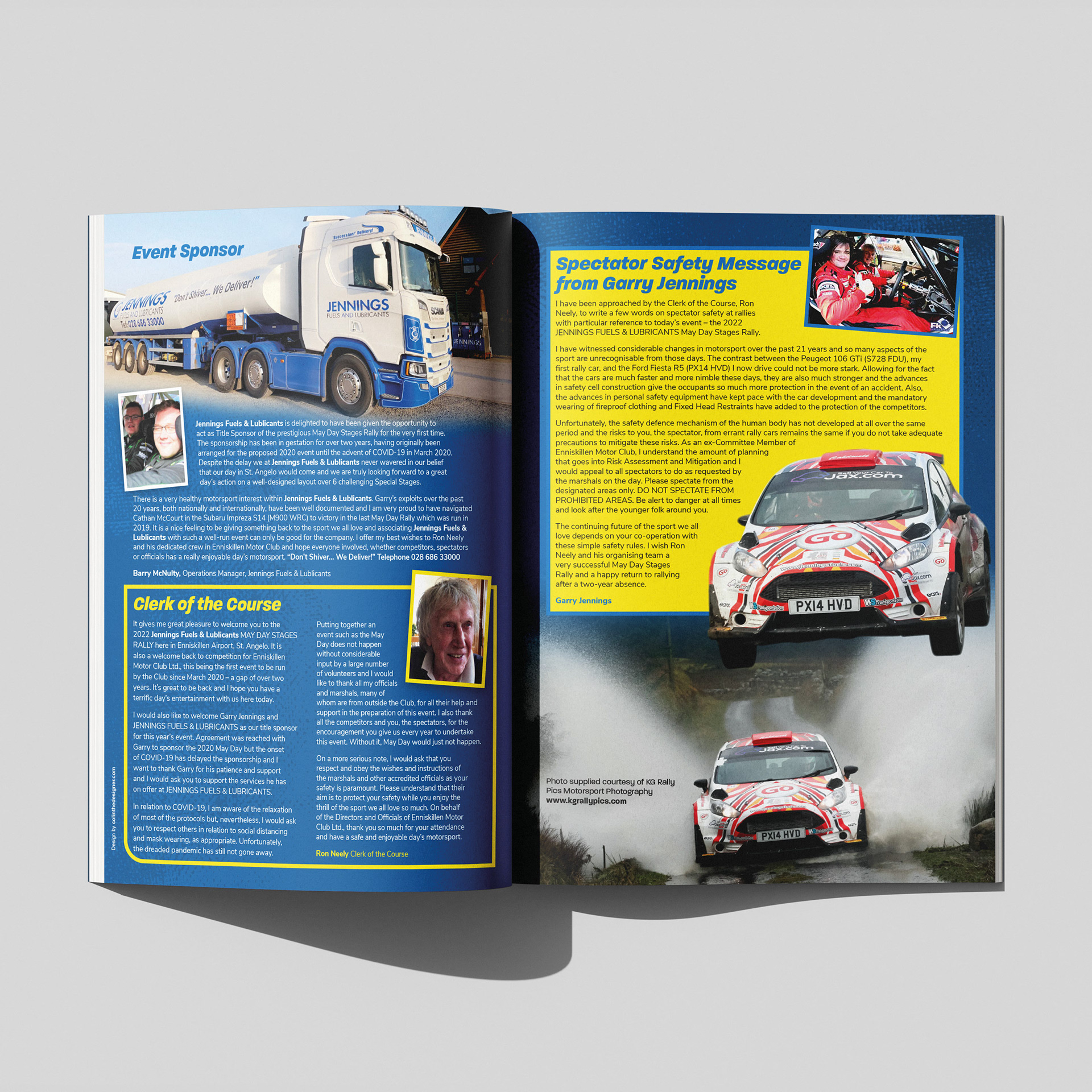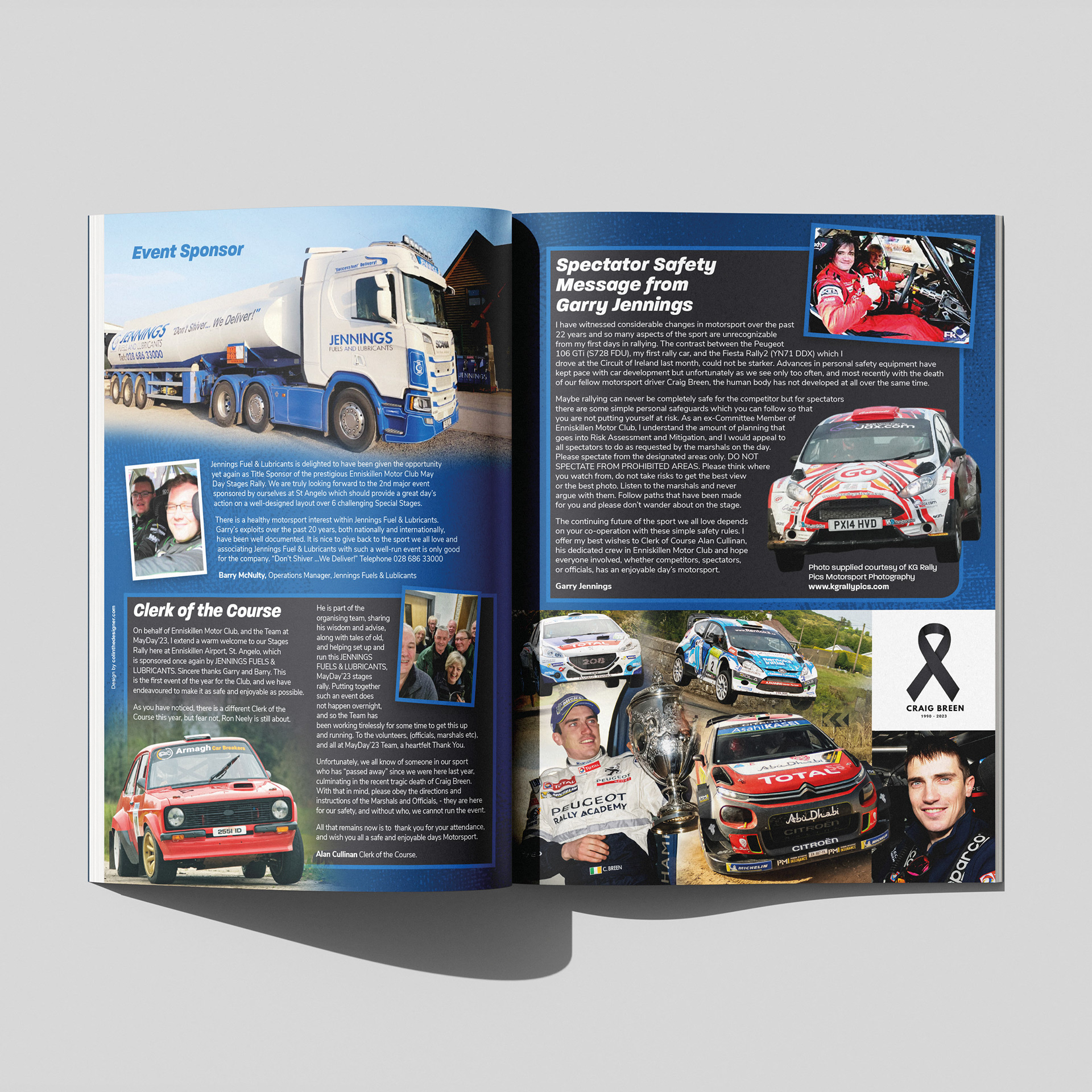 Working with Enniskillen Motor Club since 2014 has allowed me to build a deep understanding of the club’s heritage, professionalism, and the unique energy surrounding its events. That long‑standing collaboration shaped the design approach behind the 2024, 2023, and 2022 May Day Stages Rally booklets, each one refining how information and visual storytelling come together.