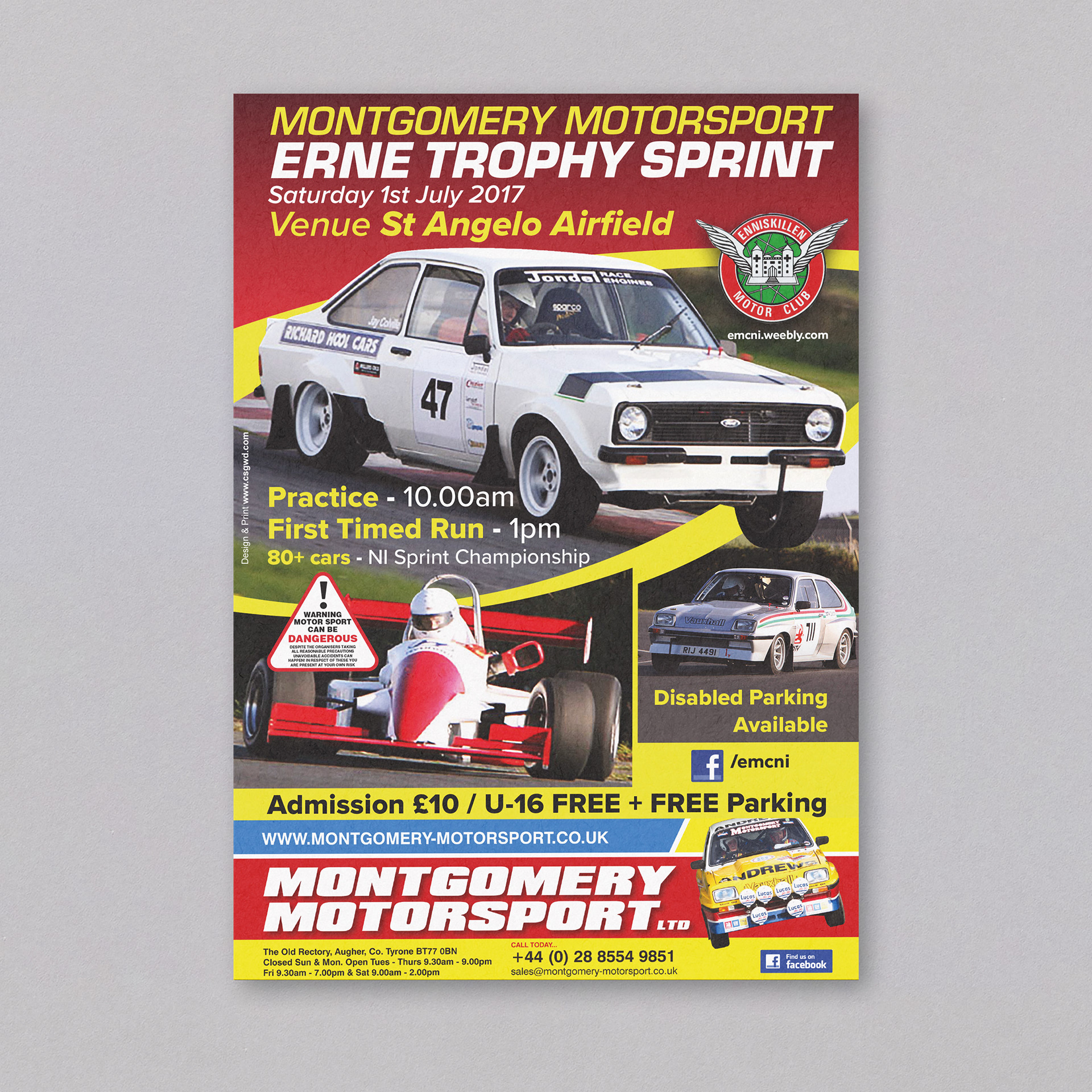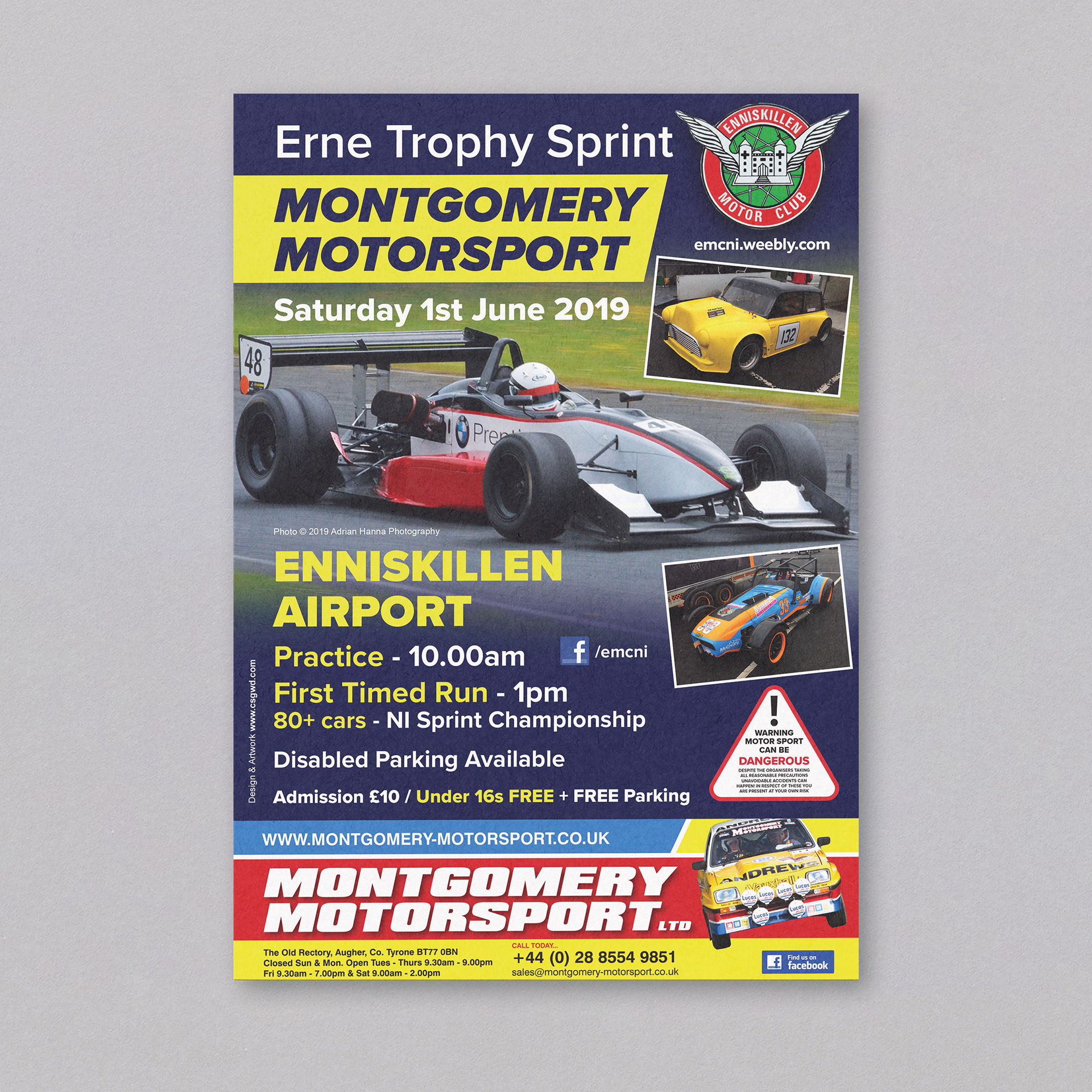 I designed this poster to promote the Erne Trophy Sprint, a high-energy motorsport event held at Enniskillen Airport and organized by Montgomery Motorsport.