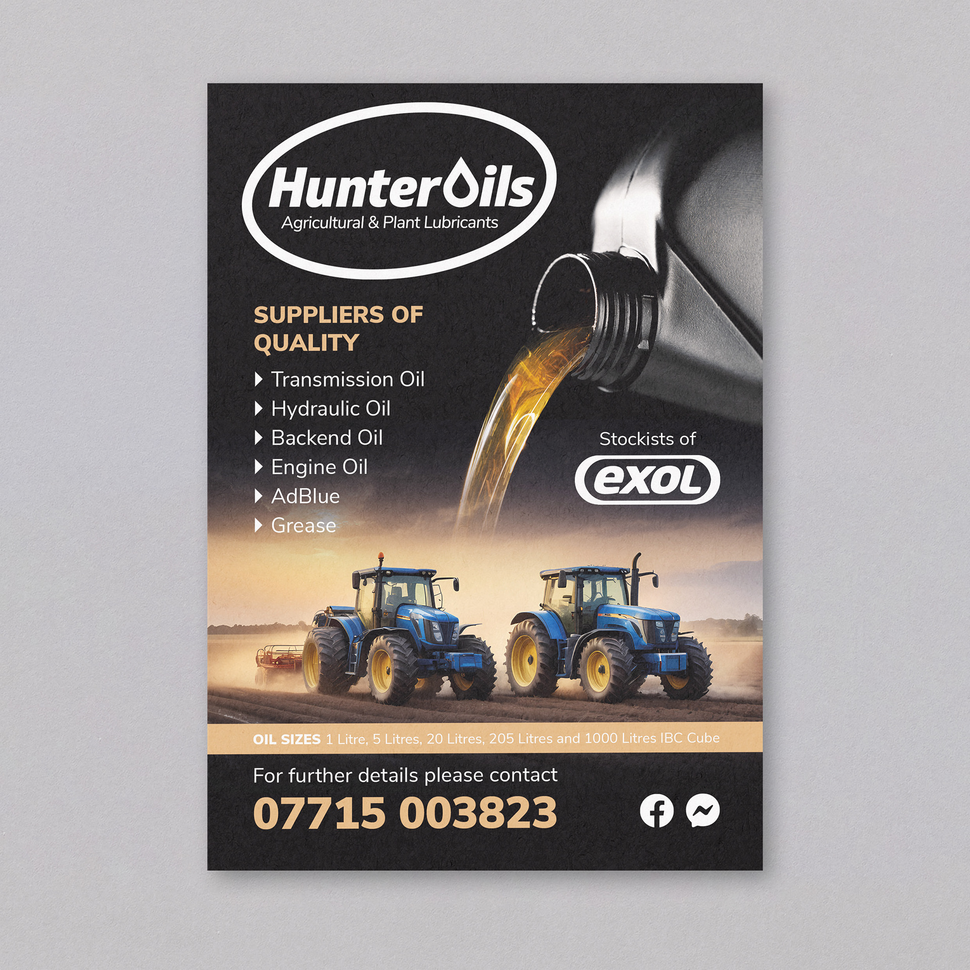 I designed this flyer for Hunter Oils to promote their range of agricultural and plant lubricants, with a focus on clarity, reliability, and rural relevance. The visual of oil pouring and tractors in the field immediately connects with the farming community, while the product list, Transmission Oil, Hydraulic Oil, AdBlue, and more, offers practical detail.