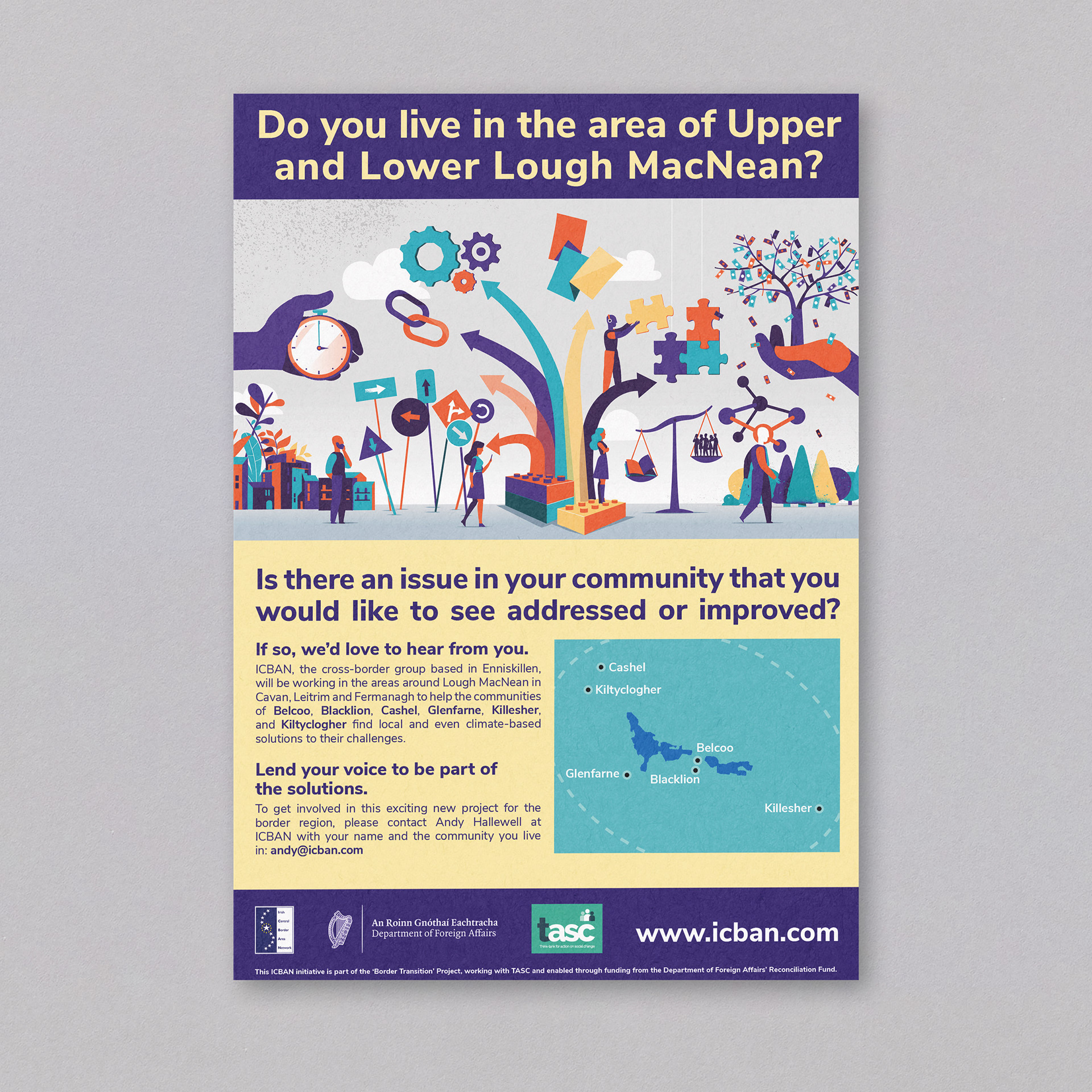 I designed this poster to support a community outreach initiative around Upper and Lower Lough MacNean, led by ICBAN. My goal was to create an inviting and energetic visual that encourages local residents to engage with issues affecting their area. I used vibrant illustrations, gears, puzzle pieces, and people, to symbolize collaboration, problem-solving, and shared responsibility.
