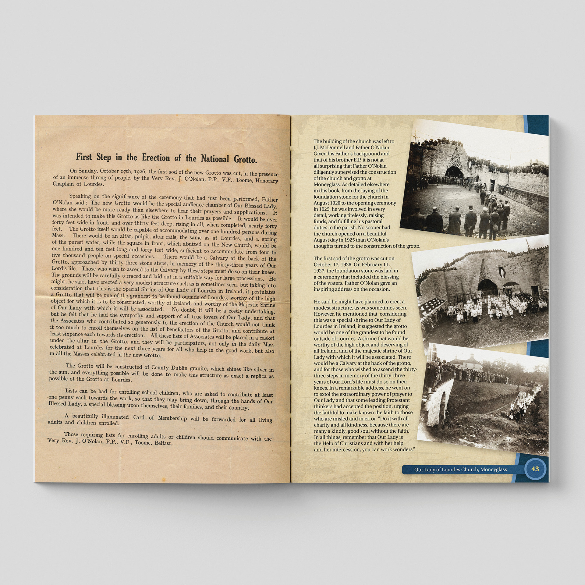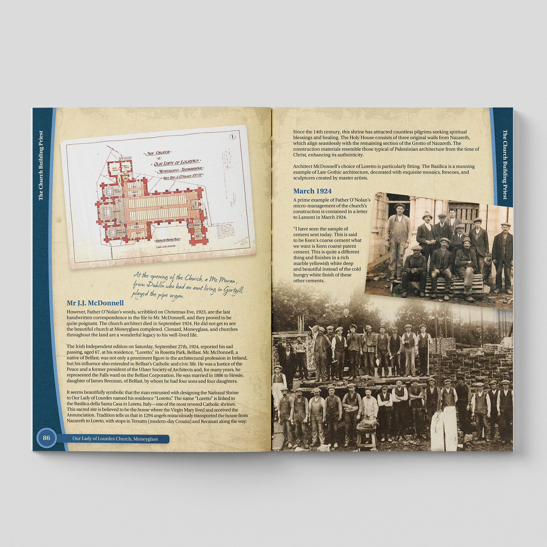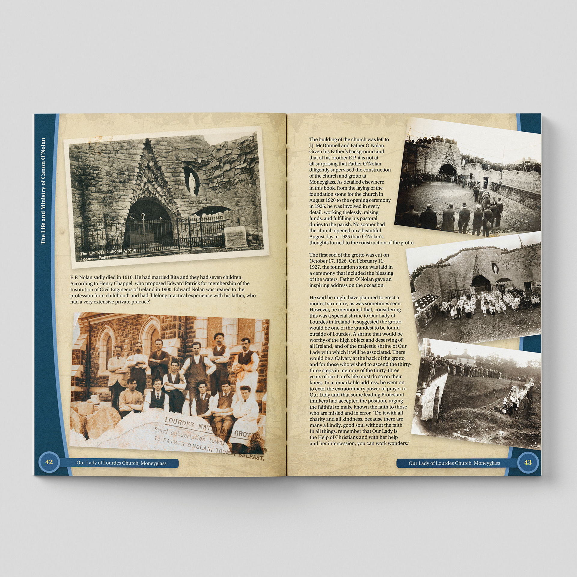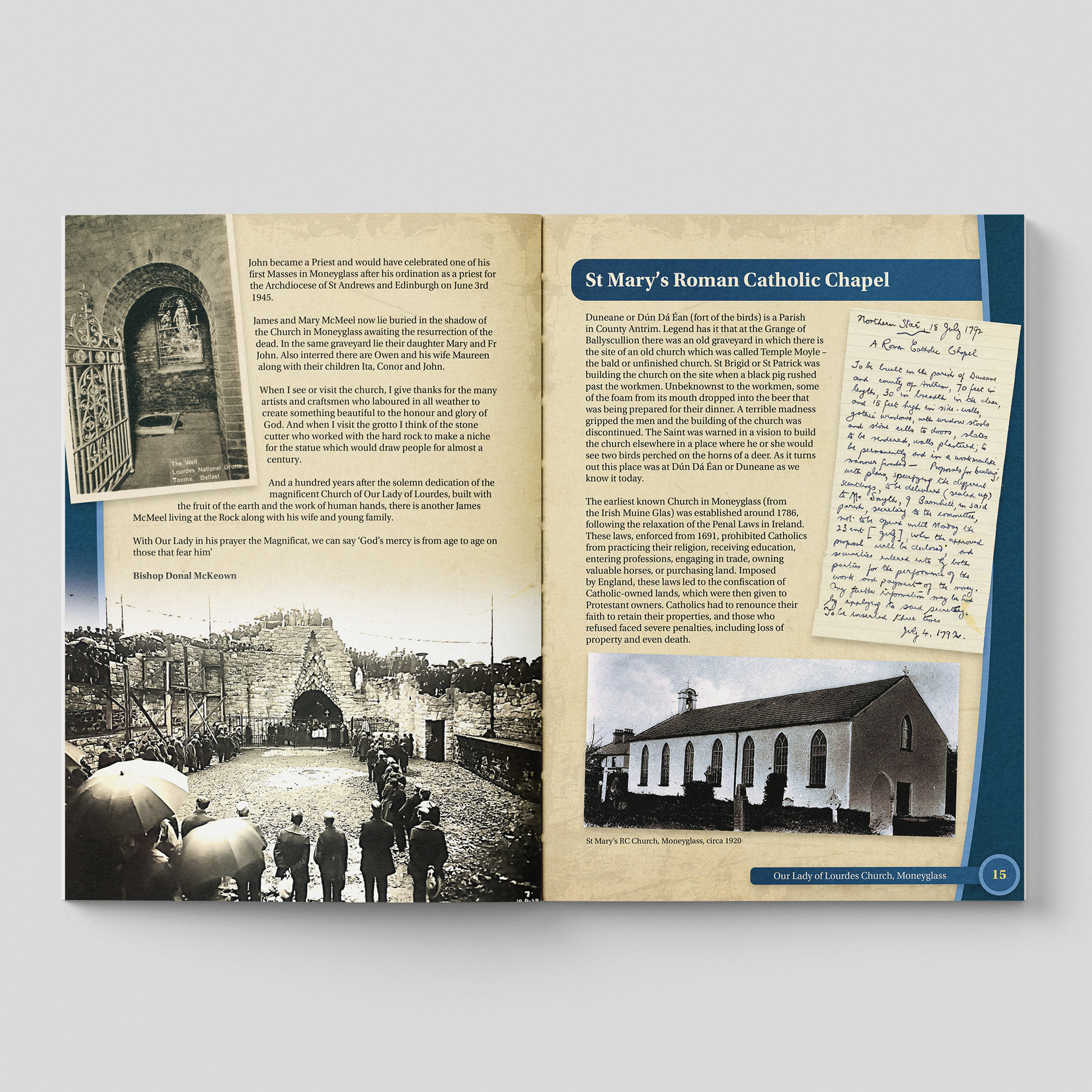My design for the Moneyglass Chapel book focuses on creating a clear, reverent visual narrative that honours the chapel’s heritage and the community it has shaped for generations. I developed a clean, spacious layout that allows archival photographs, parish records, and personal stories to breathe, guiding readers through the chapel’s origins, architectural evolution, and the faith traditions rooted in this place.