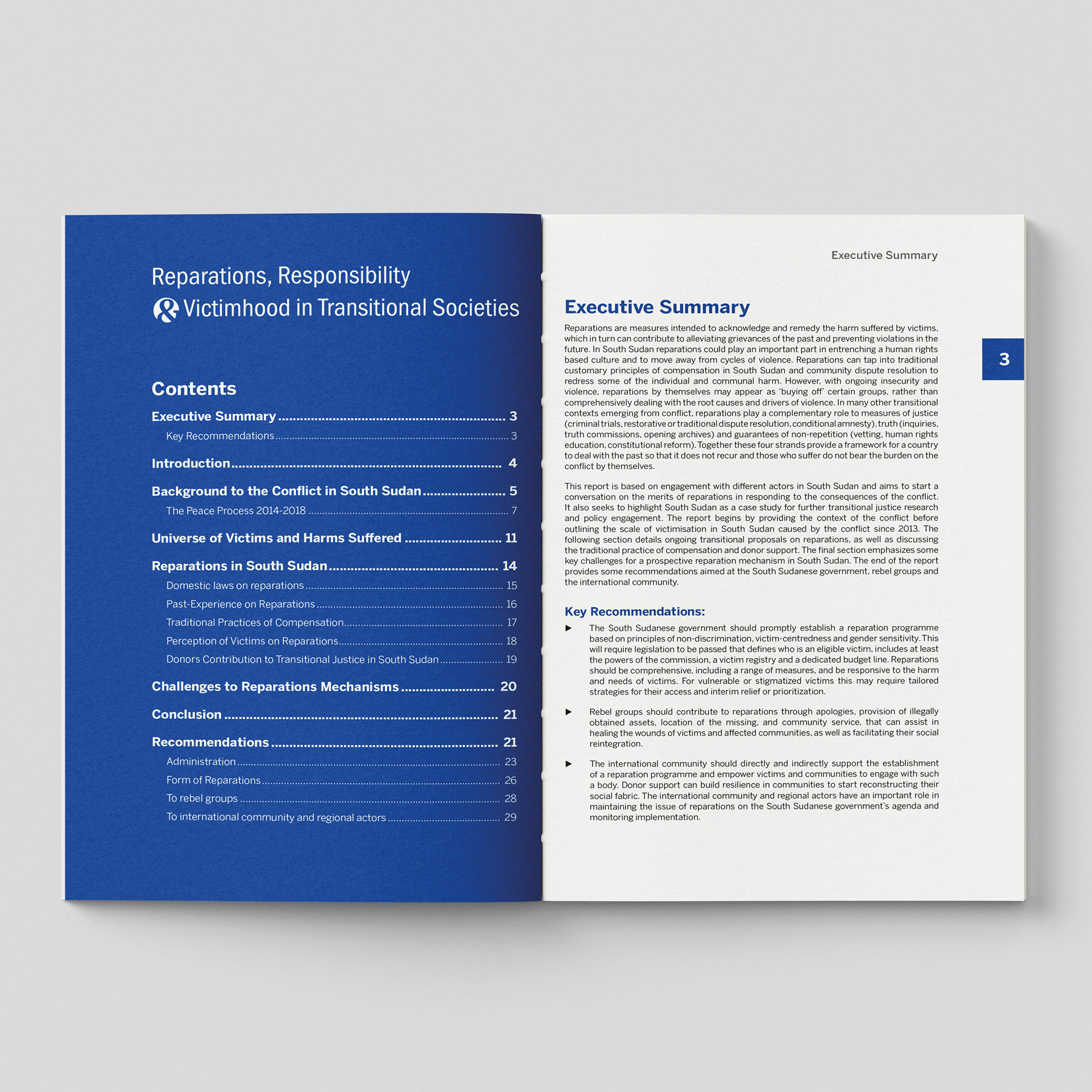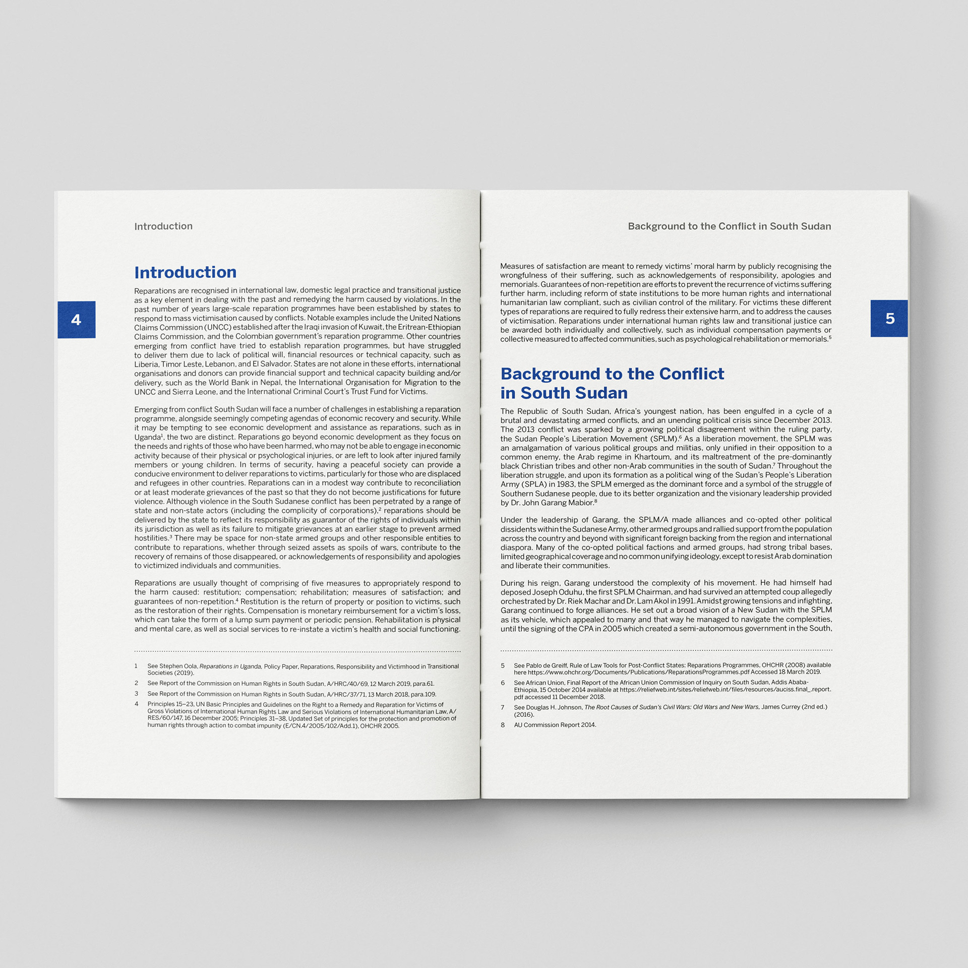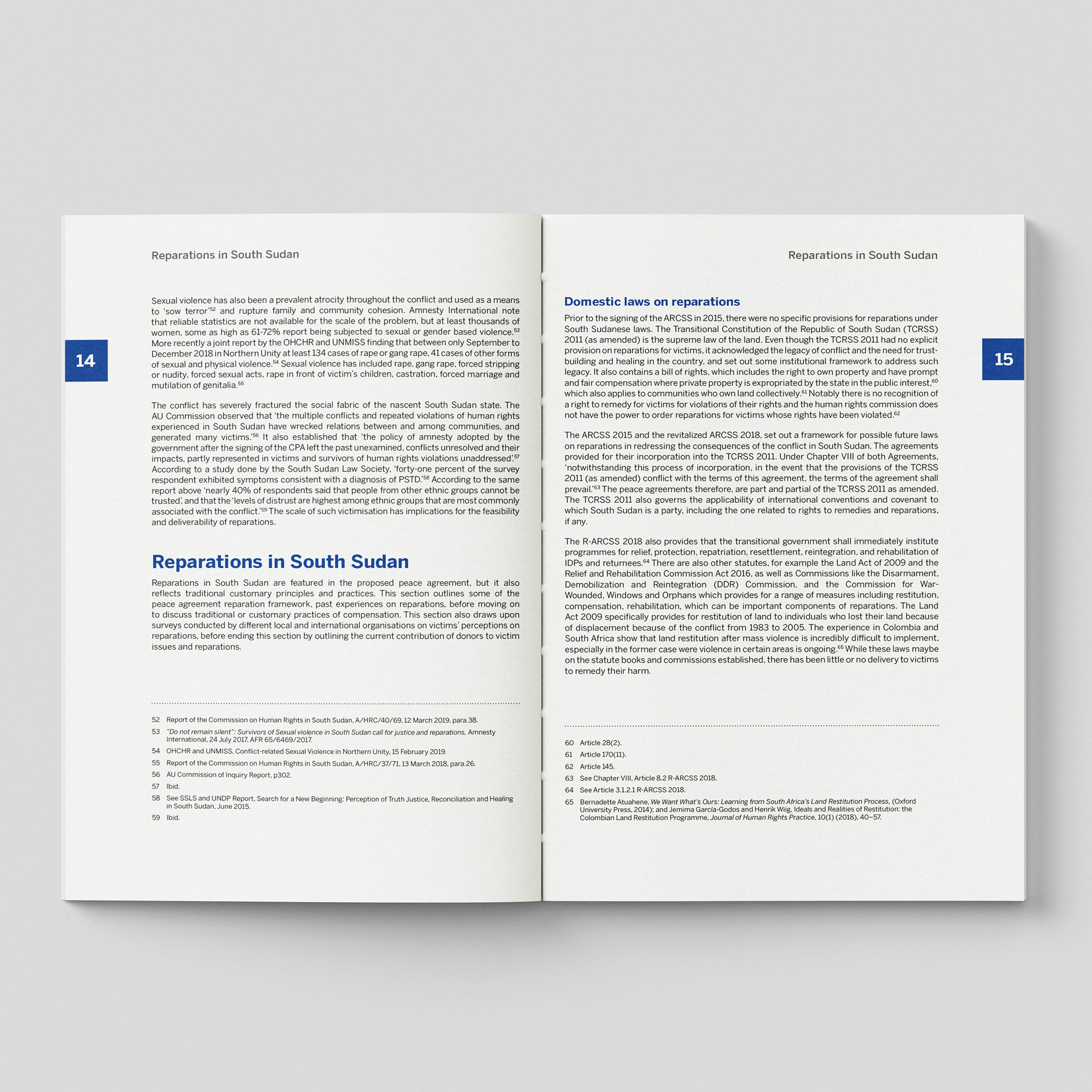 I approached the design of this publication with a focus on clarity, dignity, and calm structure, knowing the report’s subject matter, South Sudan’s long struggle with conflict, victimisation, and the complex path toward reparations, carries enormous emotional weight. I rebuilt the layout to guide readers through its analysis of harms suffered, traditional compensation practices, and the challenges of establishing a national reparations programme.