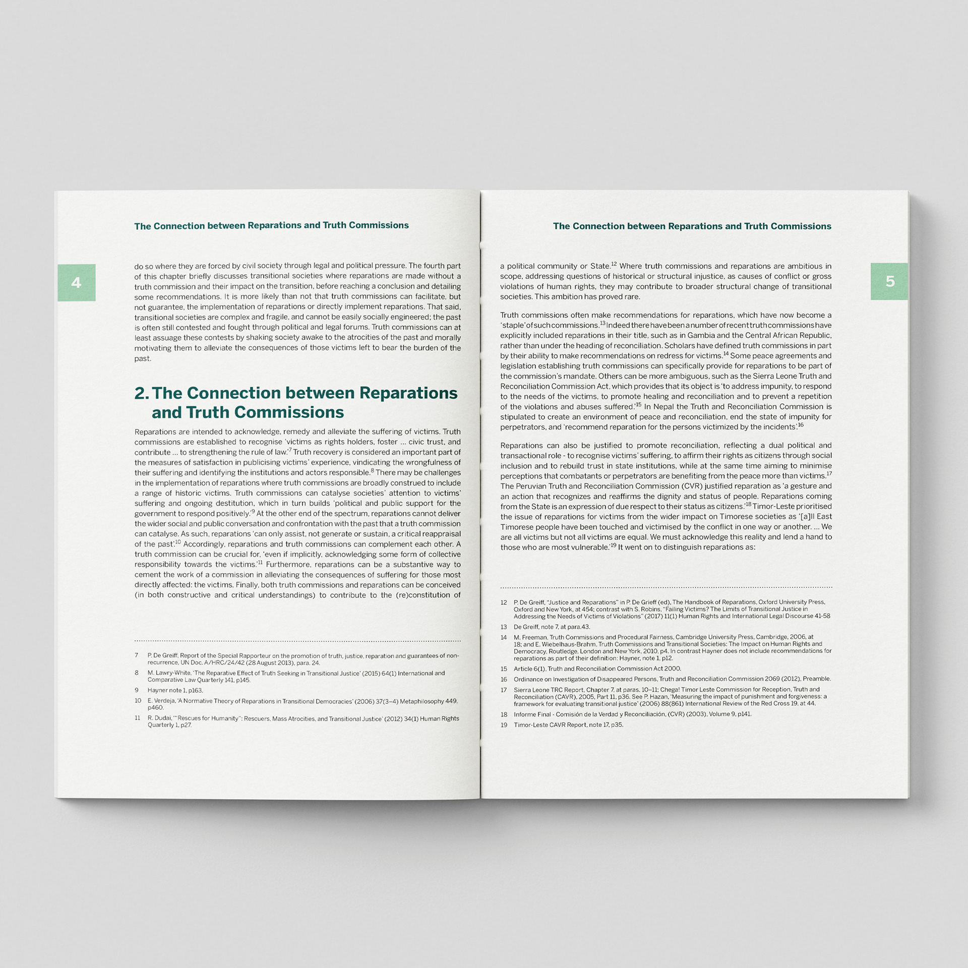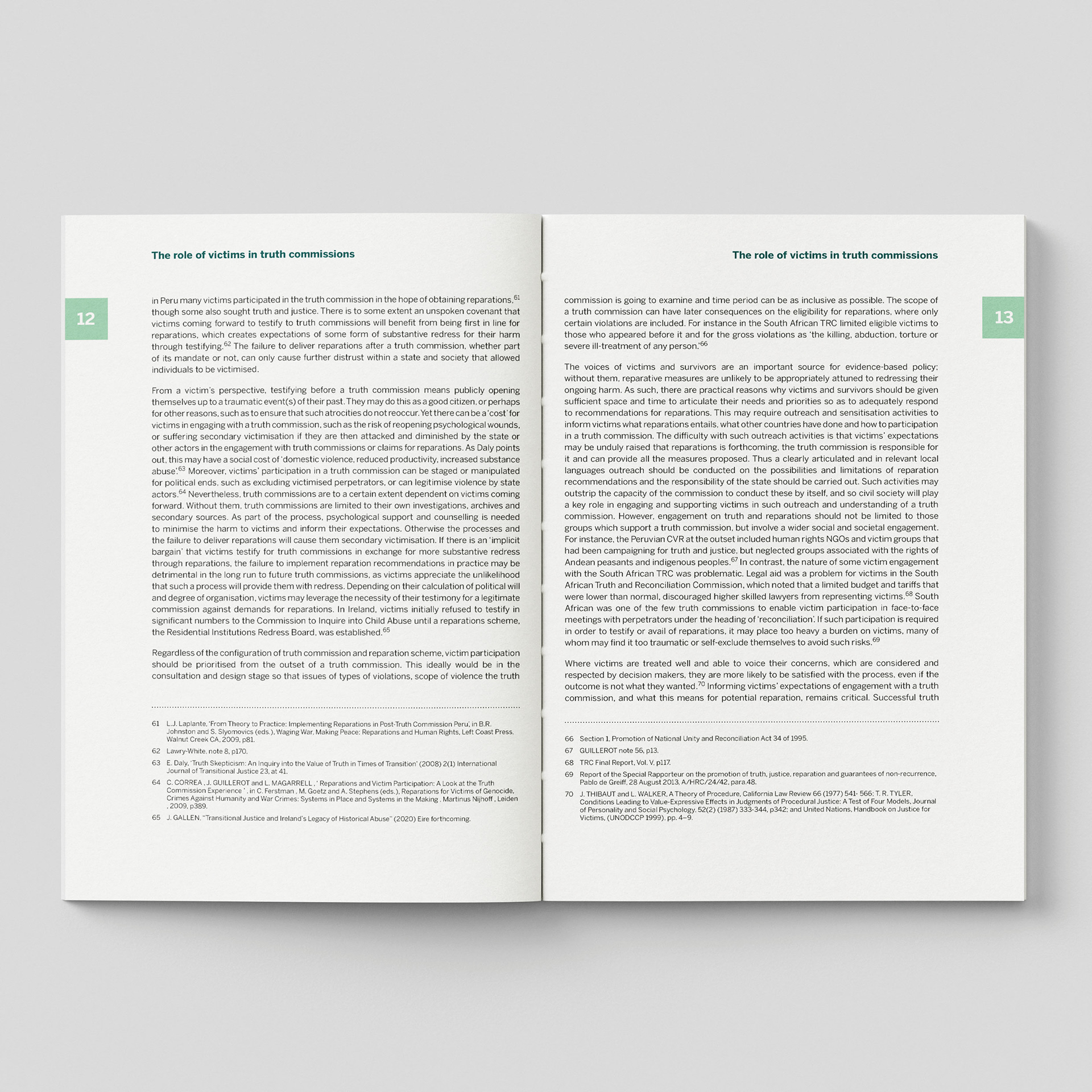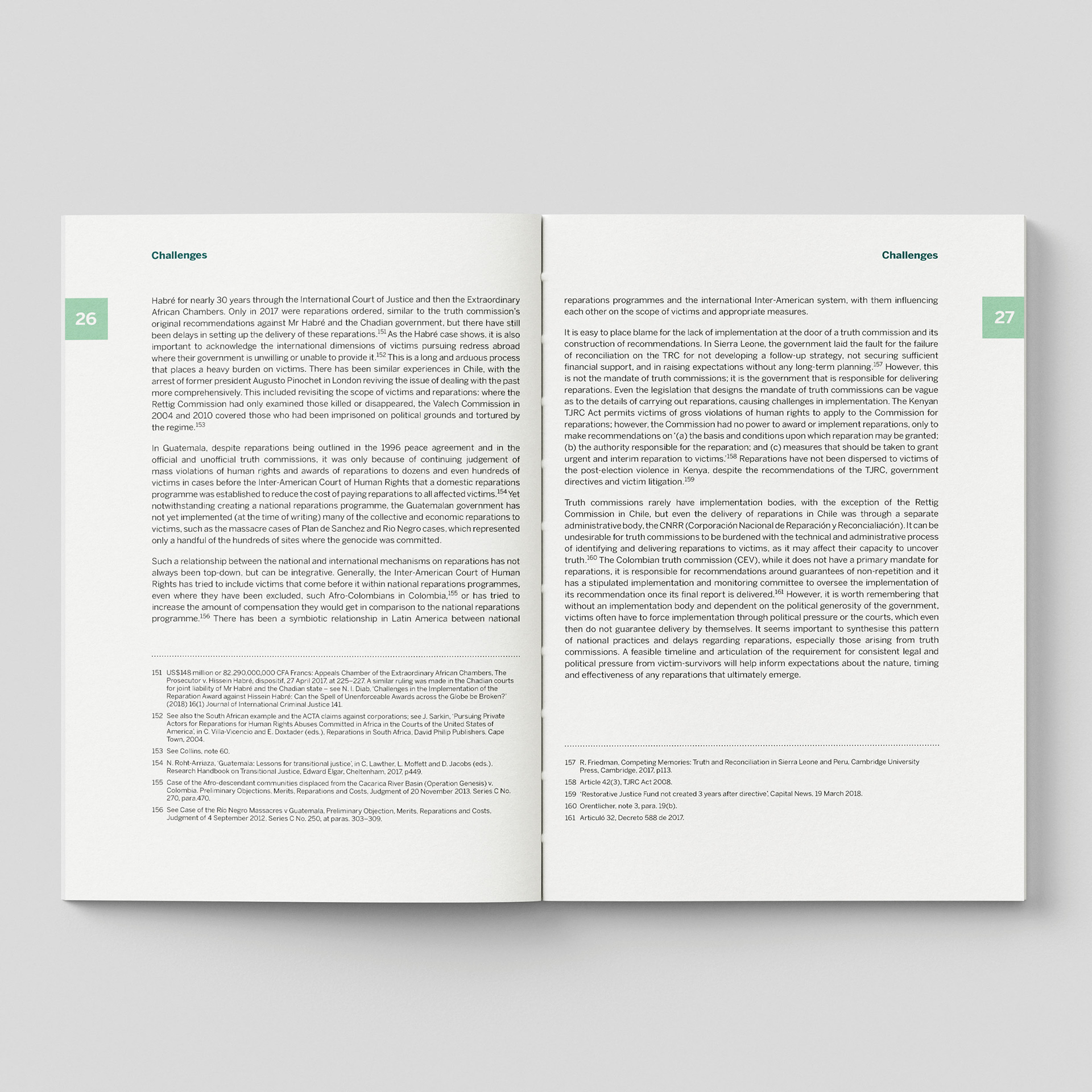I designed this publication with a focus on clarity, dignity, and accessibility, shaping each page to support the report’s examination of how truth commissions move societies from acknowledgement to meaningful reparations. Working with dense legal, historical, and comparative research, I created a layout that guides readers through complex discussions on victims’ rights, state responsibility, and the practical challenges of implementing reparation programmes.