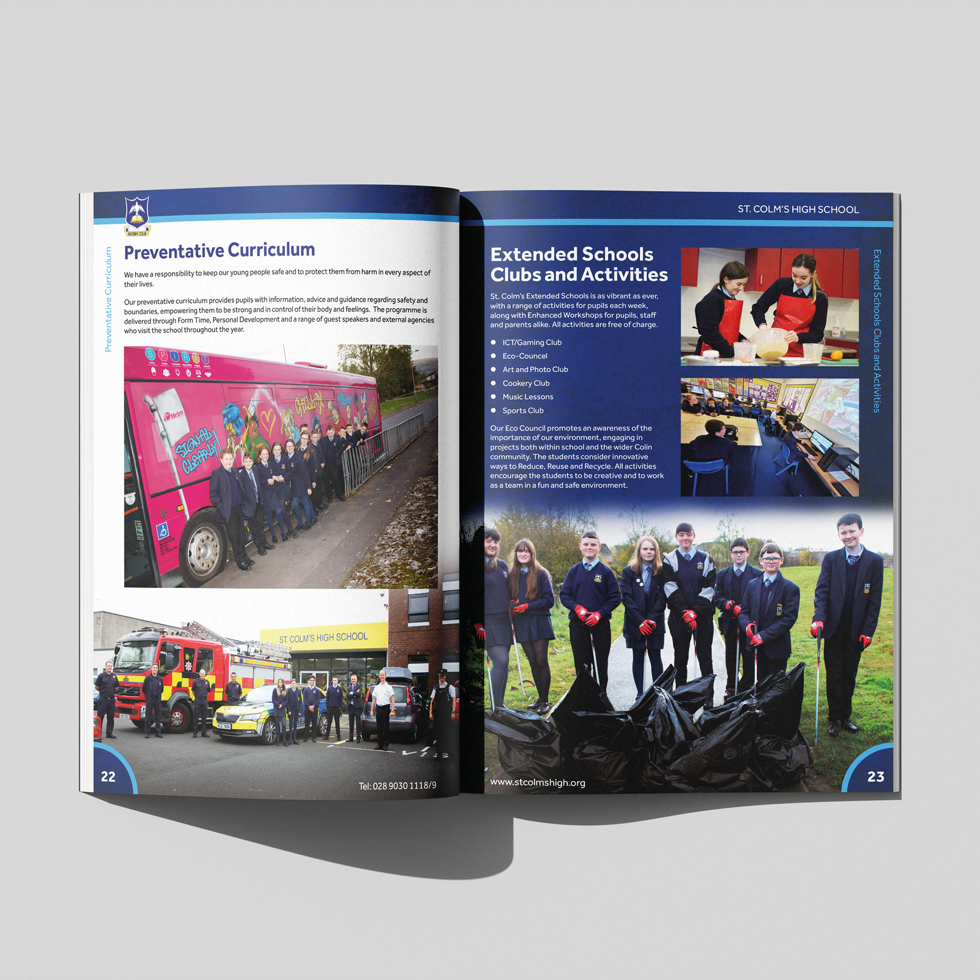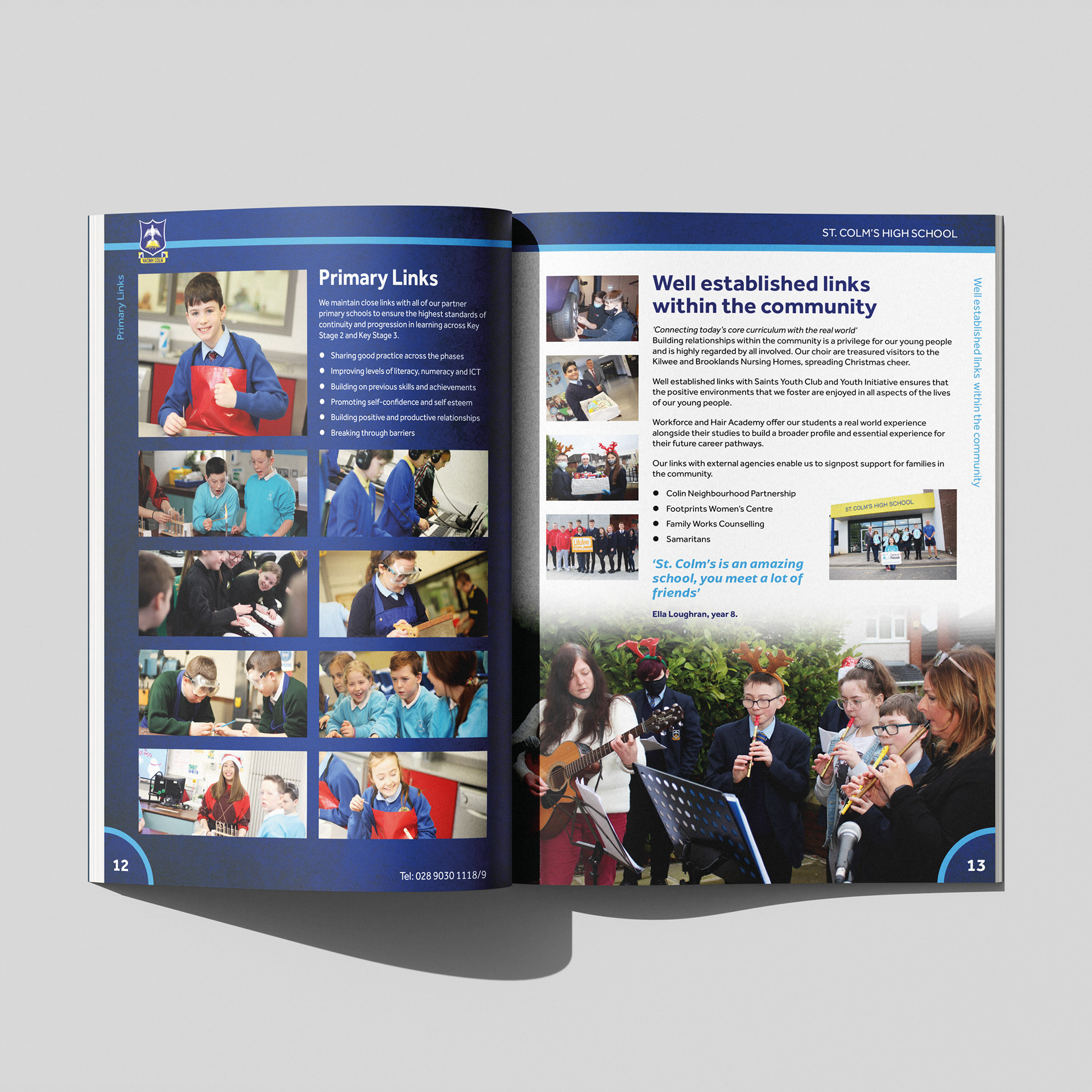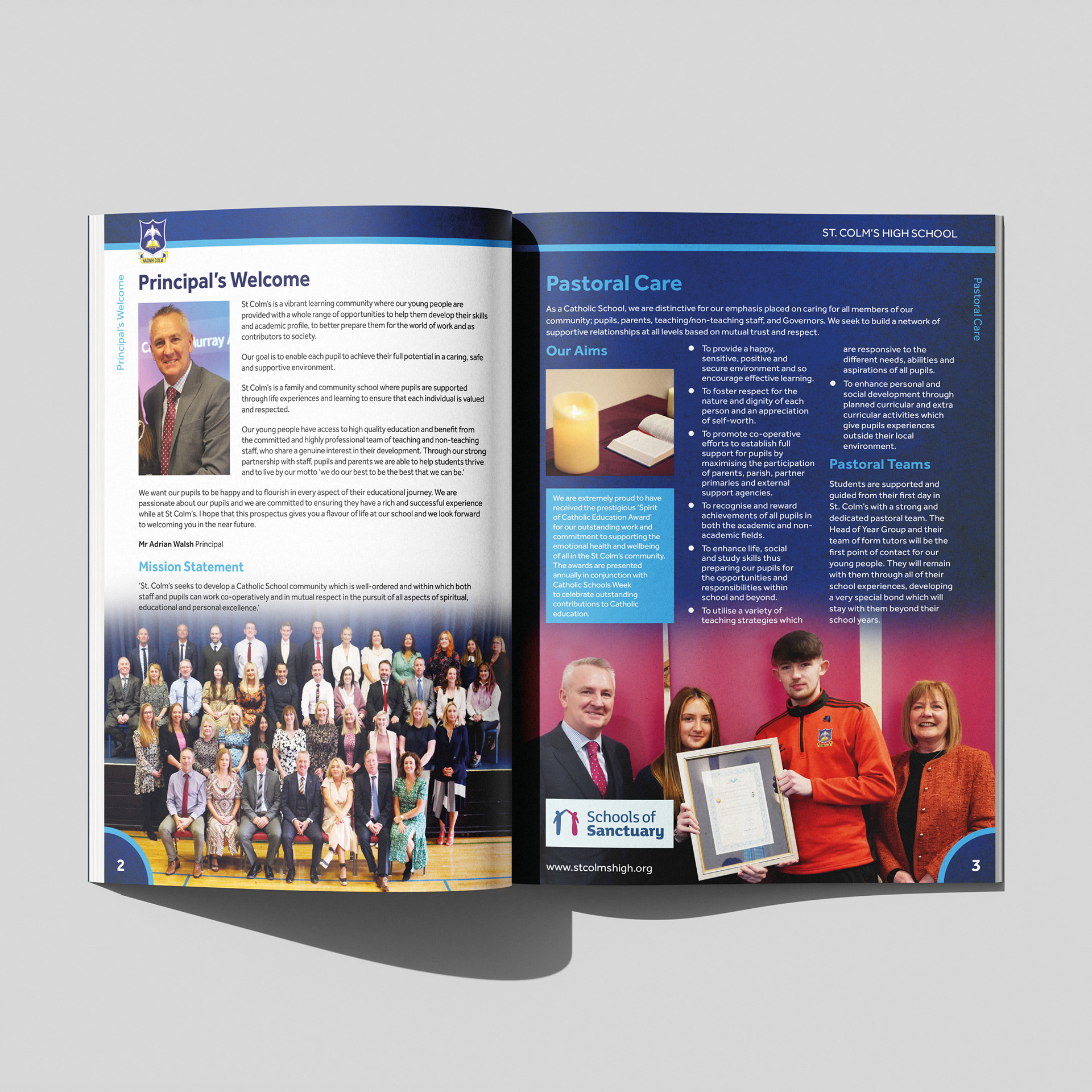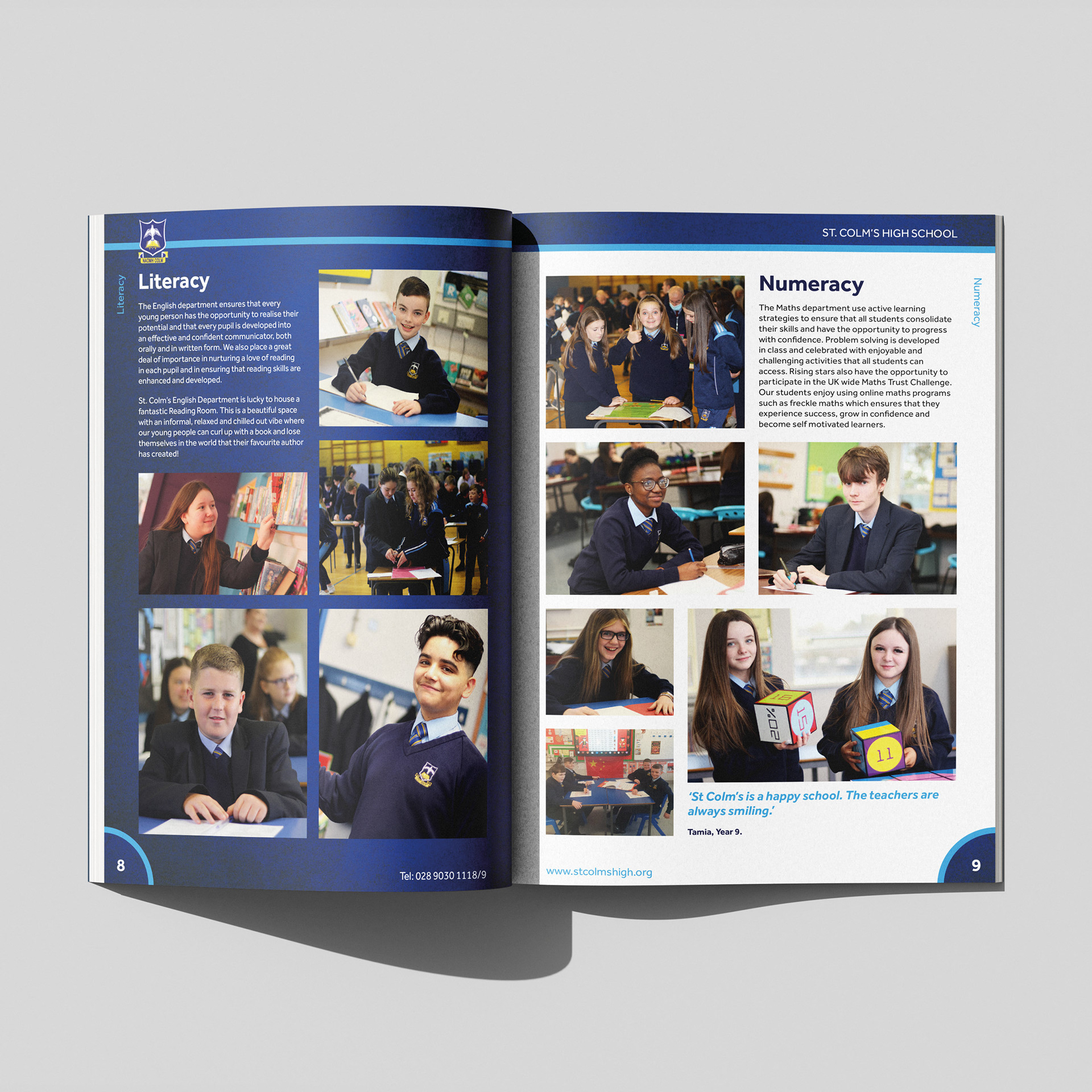 Across several years of collaboration with St. Colm’s High School in Dunmurry, Belfast, I’ve had the opportunity to shape a series of prospectuses that reflect the school’s inclusive ethos, academic ambition and strong sense of community. My role has centred on creating clear, contemporary publications that communicate effectively with both parents and pupils while maintaining a warm, welcoming tone that mirrors the school’s values.