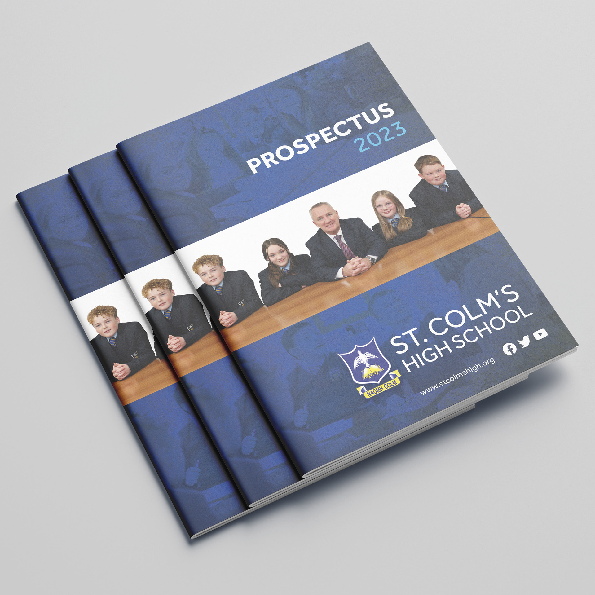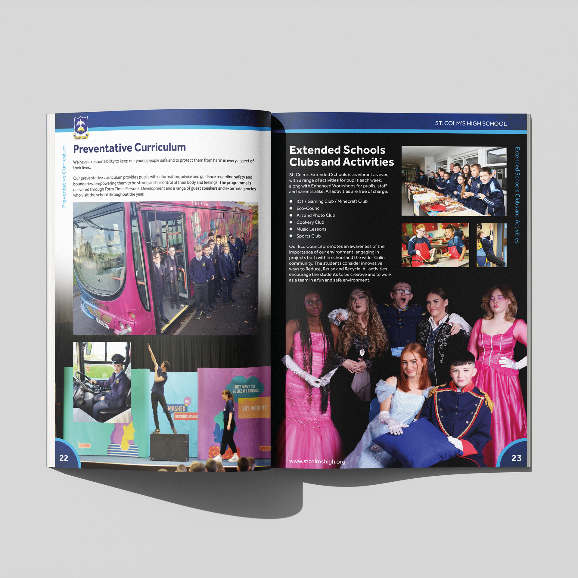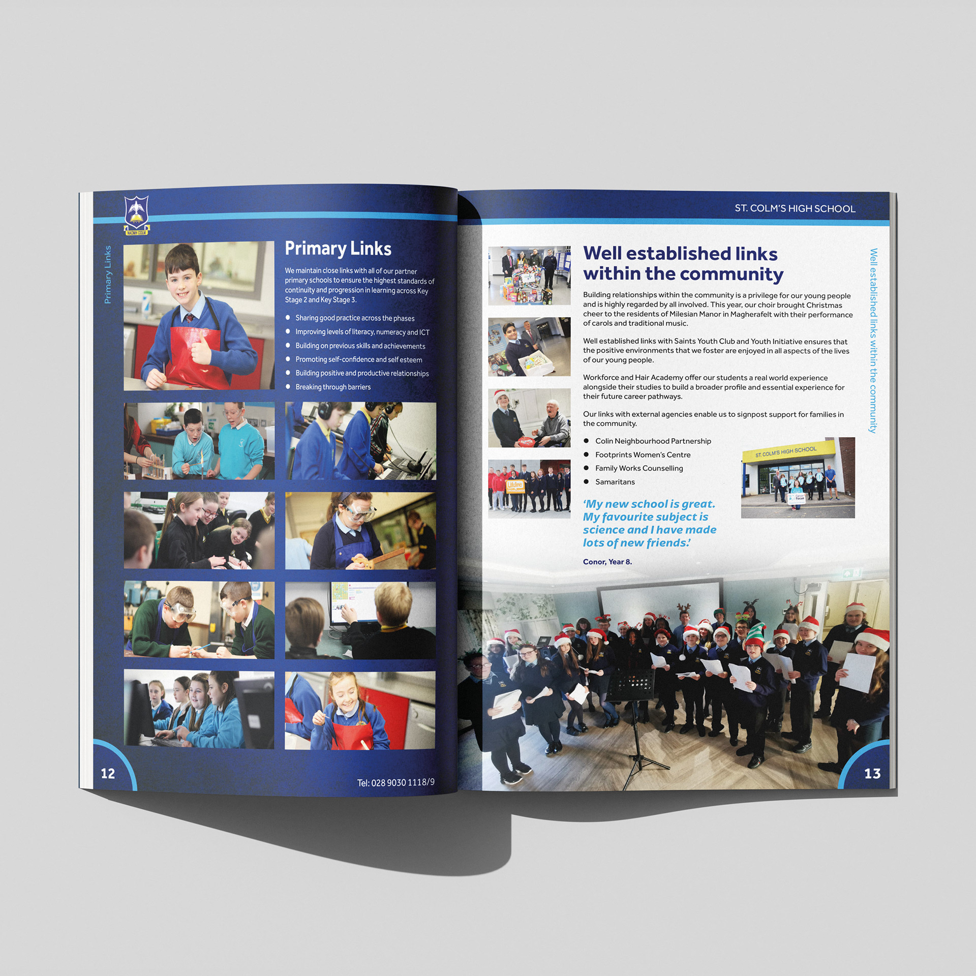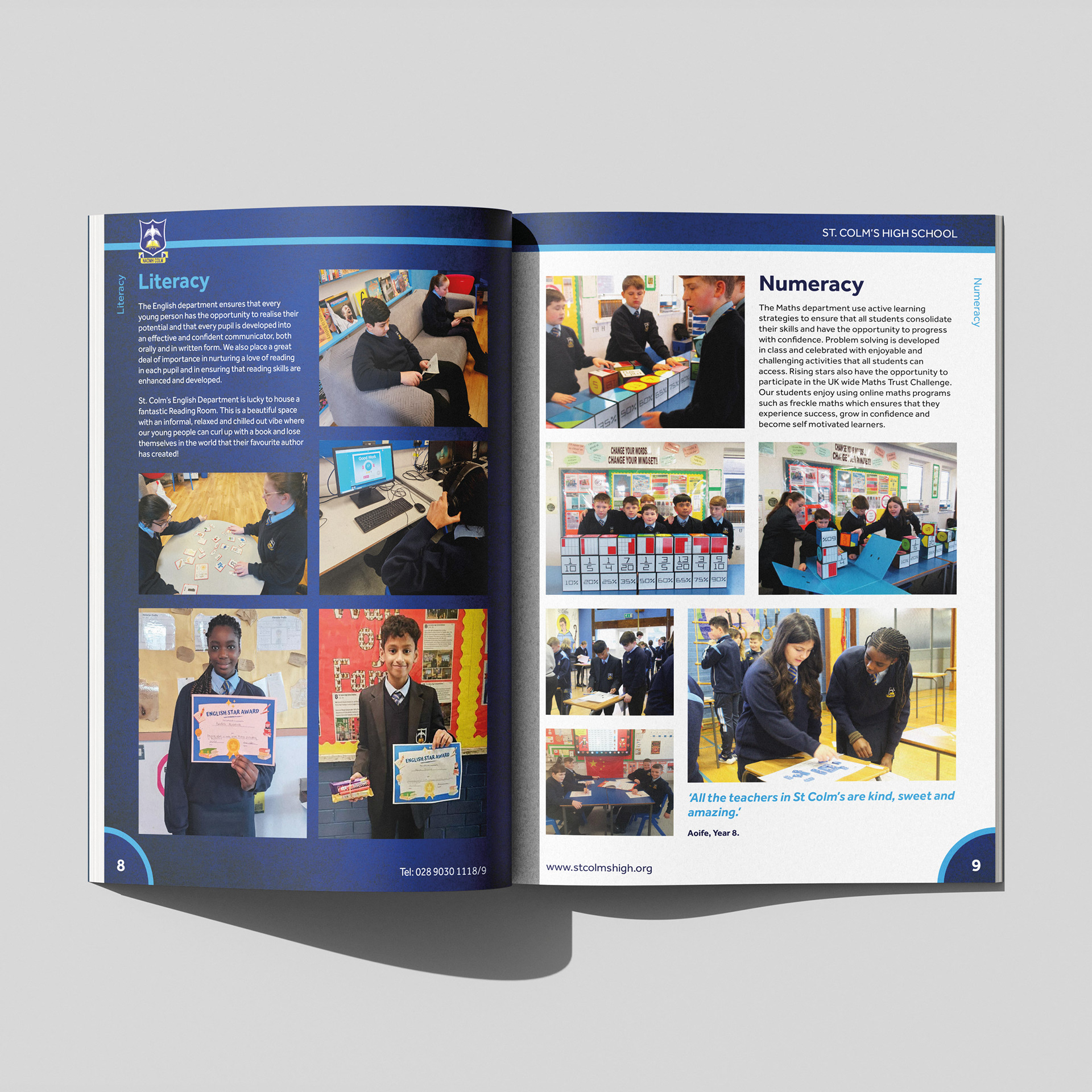 Across several years of collaboration with St. Colm’s High School in Dunmurry, Belfast, I’ve had the opportunity to shape a series of prospectuses that reflect the school’s inclusive ethos, academic ambition and strong sense of community. My role has centred on creating clear, contemporary publications that communicate effectively with both parents and pupils while maintaining a warm, welcoming tone that mirrors the school’s values.