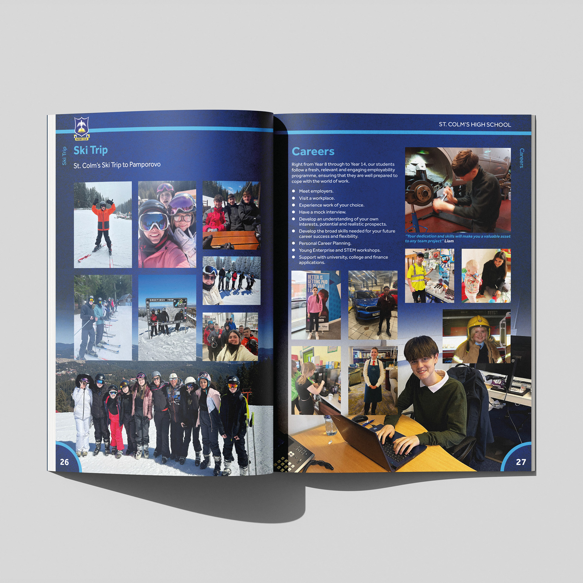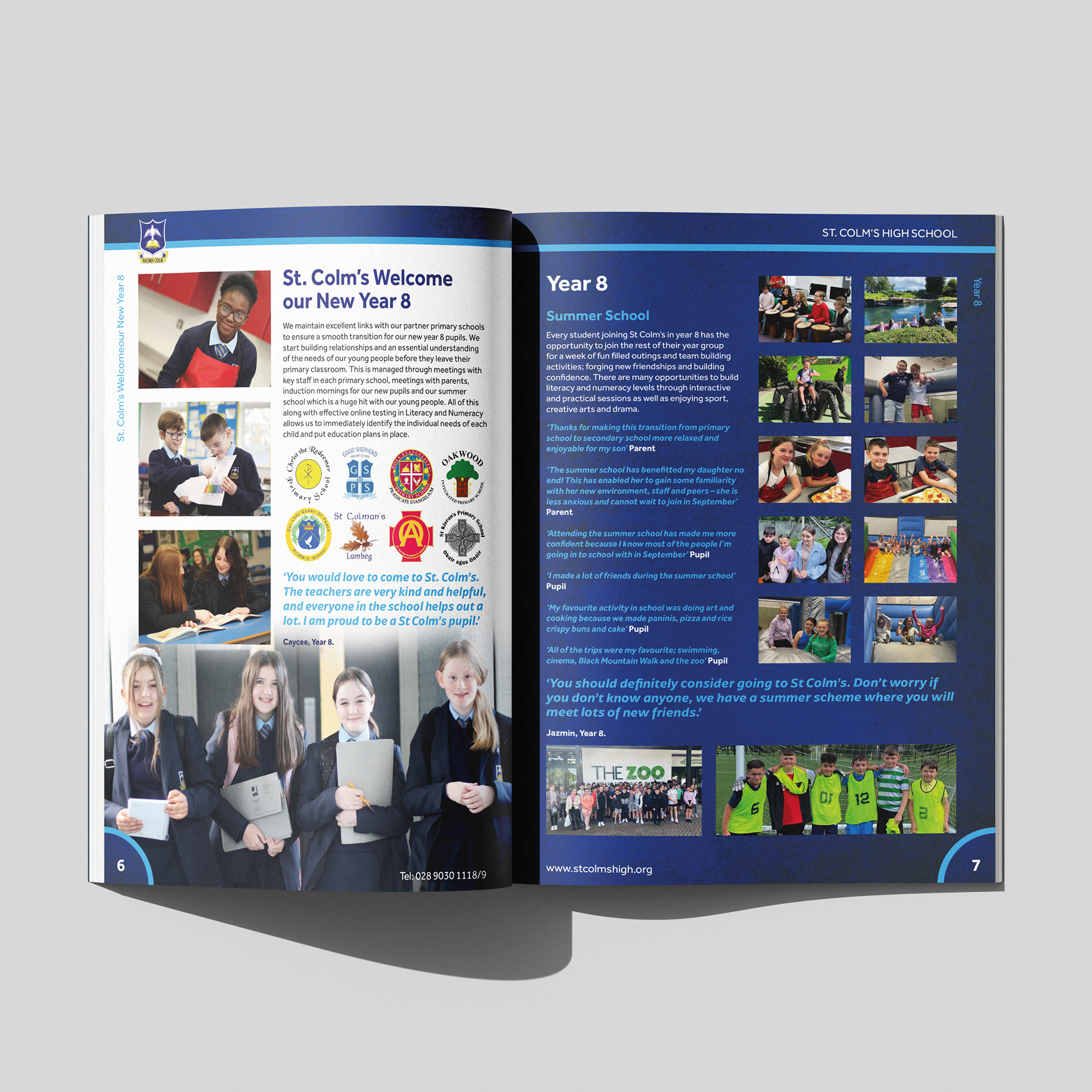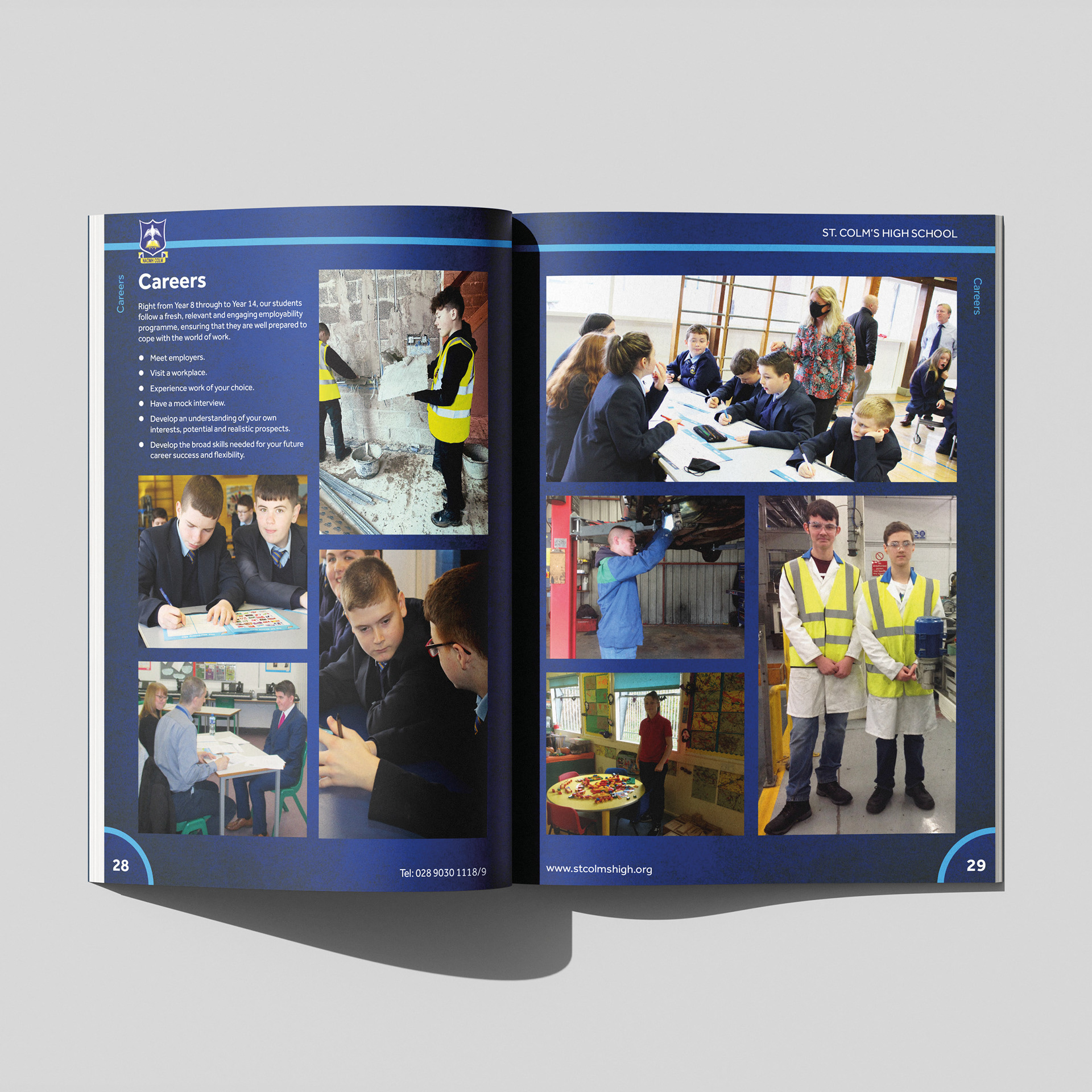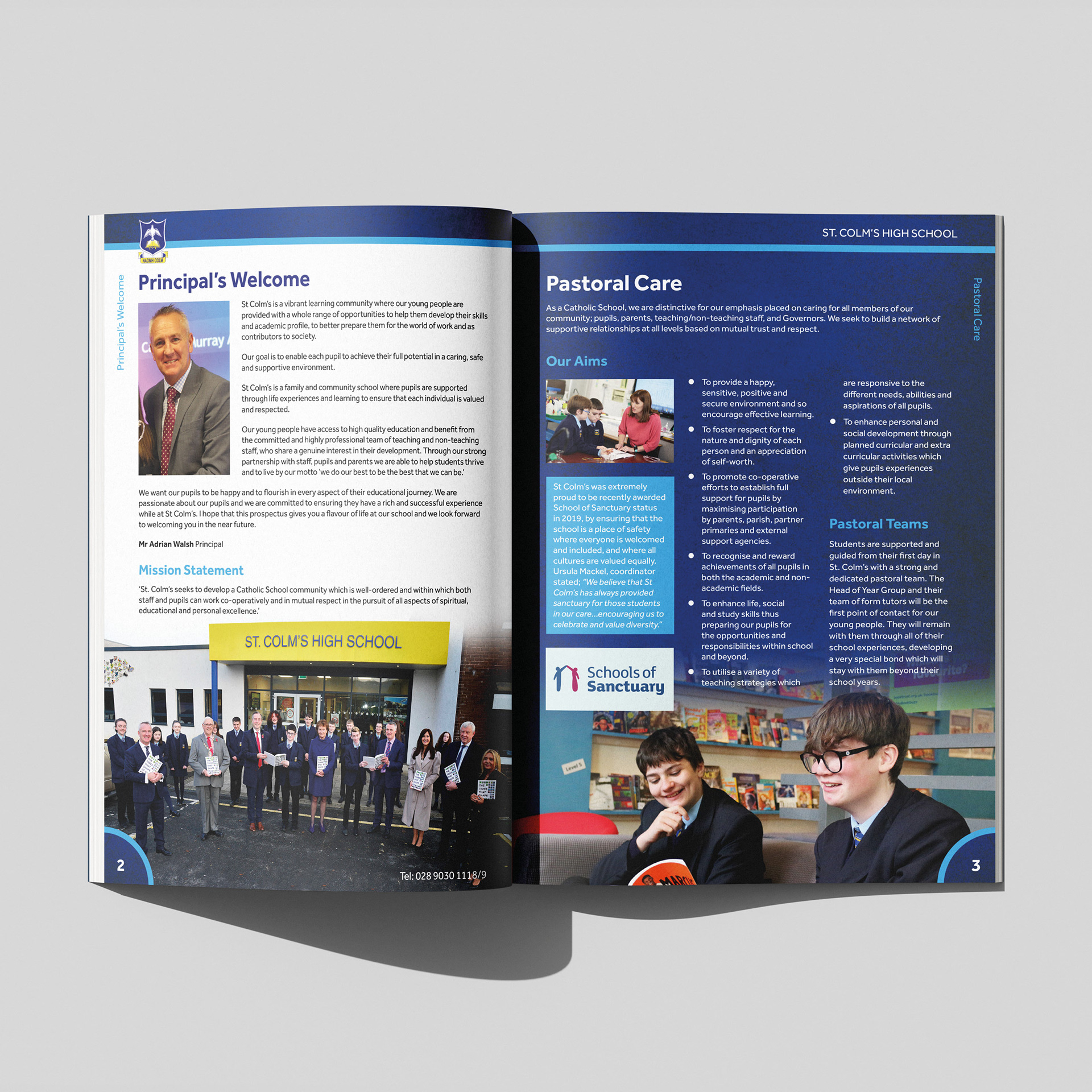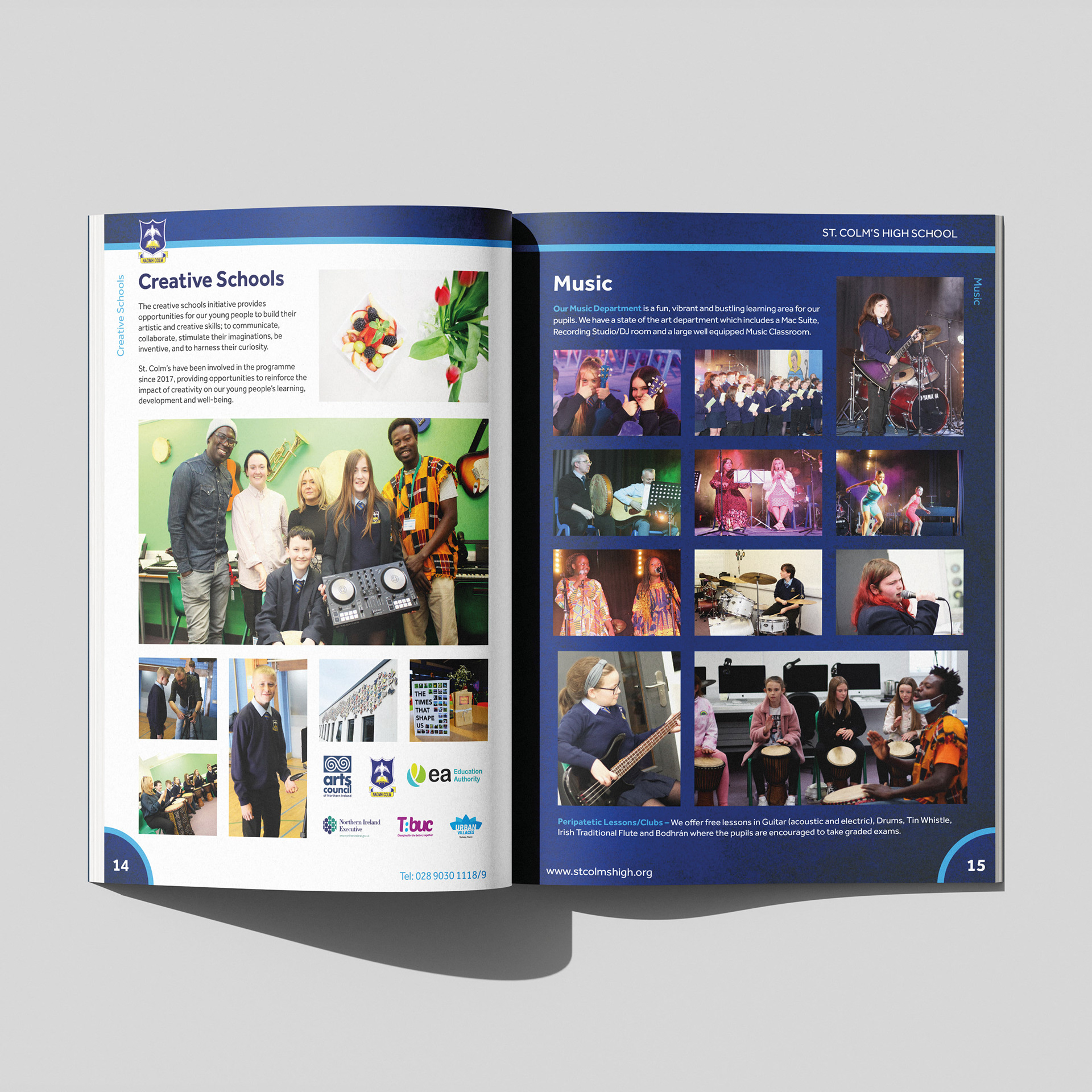 Across several years of collaboration with St. Colm’s High School in Dunmurry, Belfast, I’ve had the opportunity to shape a series of prospectuses that reflect the school’s inclusive ethos, academic ambition and strong sense of community. My role has centred on creating clear, contemporary publications that communicate effectively with both parents and pupils while maintaining a warm, welcoming tone that mirrors the school’s values.