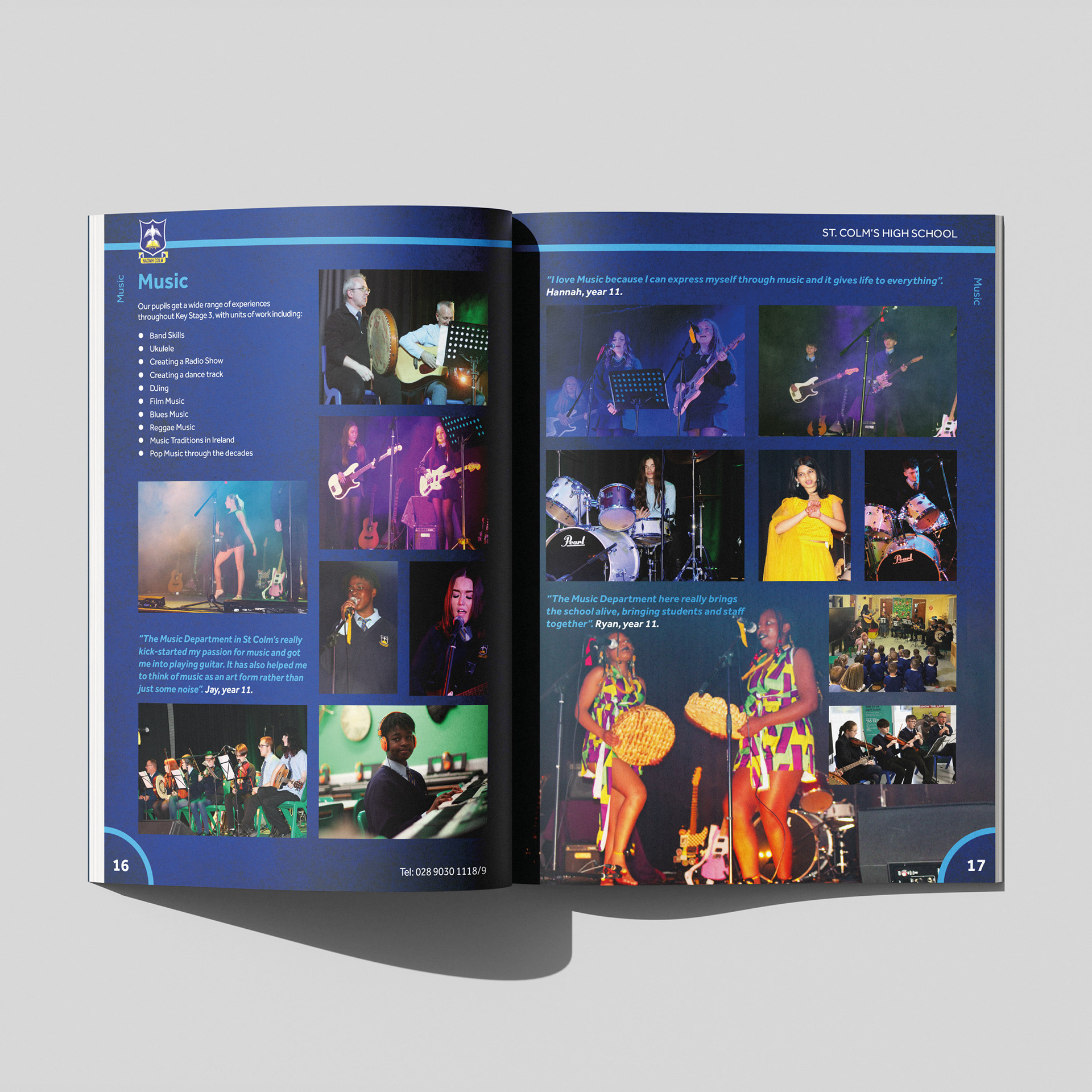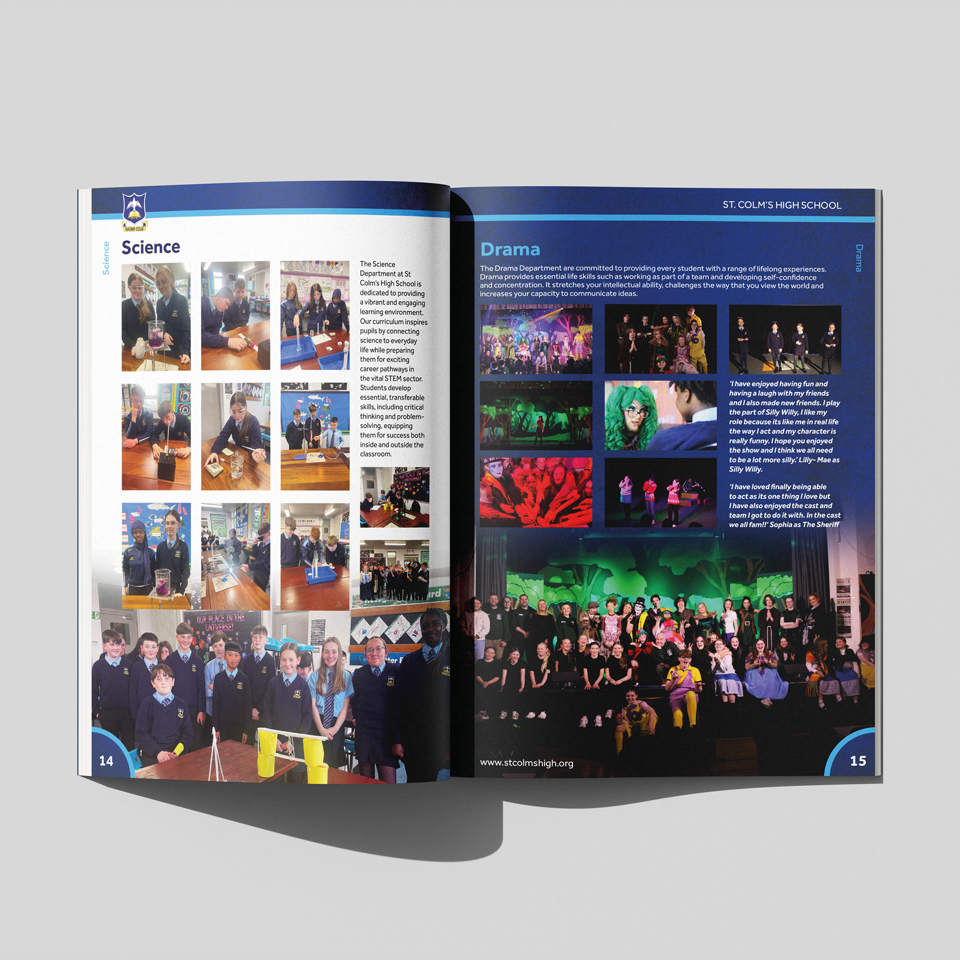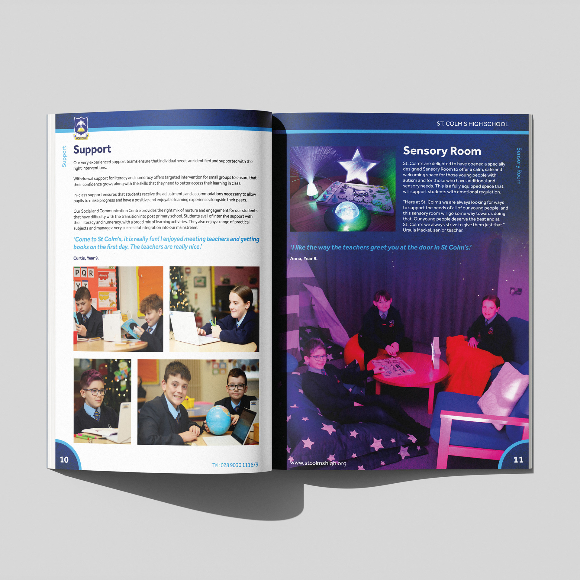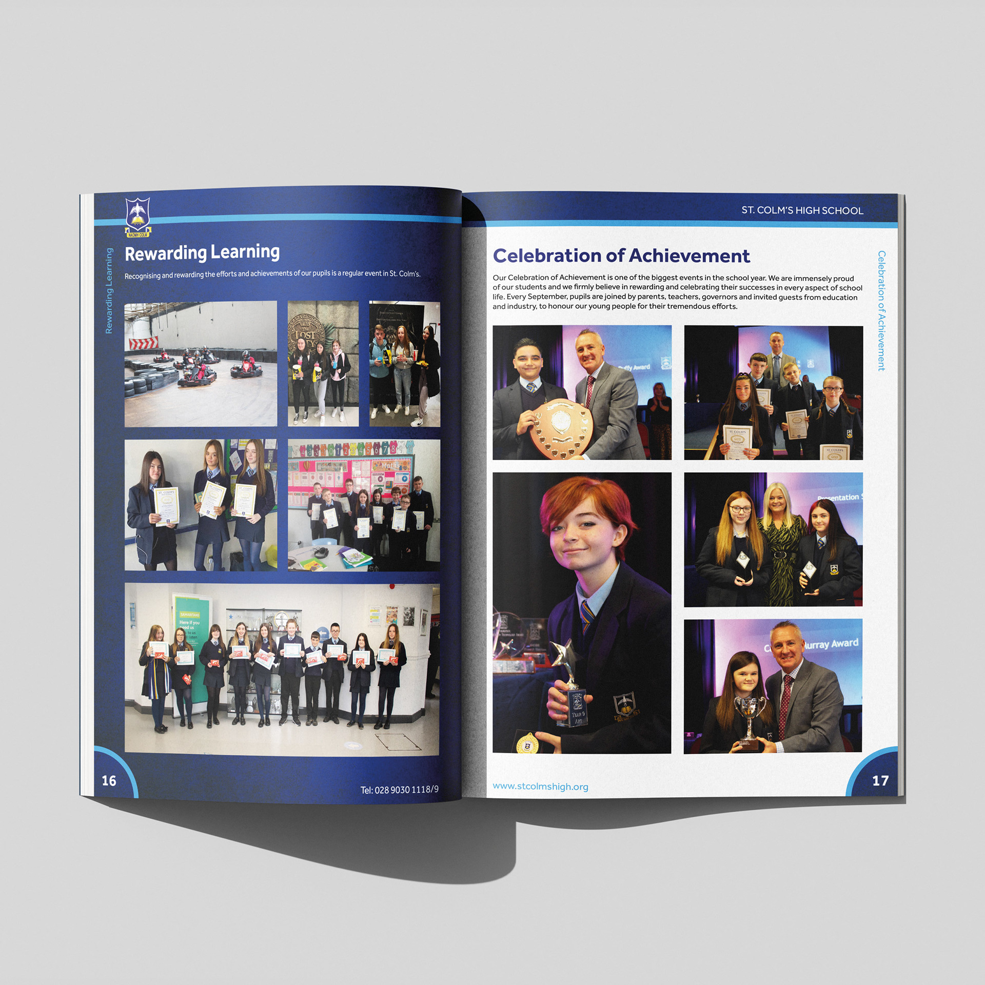 Across several years of collaboration with St. Colm’s High School in Dunmurry, Belfast, I’ve had the opportunity to shape a series of prospectuses that reflect the school’s inclusive ethos, academic ambition and strong sense of community. My role has centred on creating clear, contemporary publications that communicate effectively with both parents and pupils while maintaining a warm, welcoming tone that mirrors the school’s values.