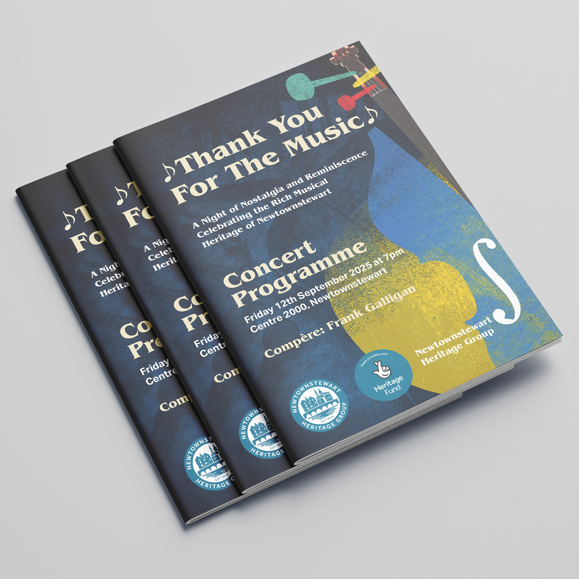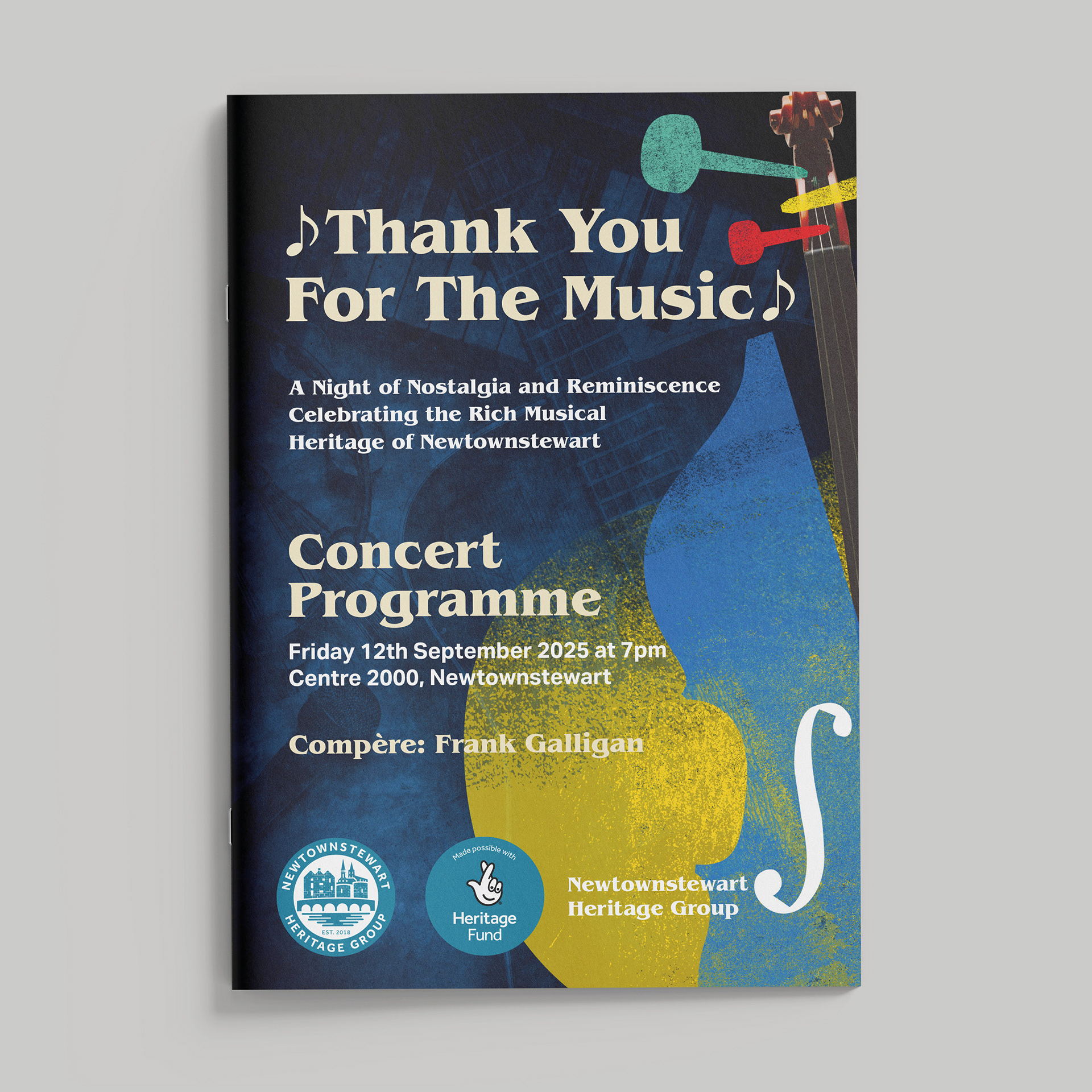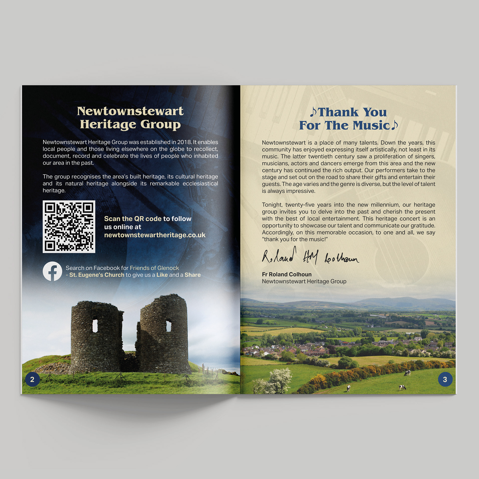 I worked with Newtownstewart Heritage Group to design and produce the concert programme Thank You For The Music!, a publication celebrating the rich cultural and musical heritage of the community. My role involved shaping the visual identity, layout, and overall narrative flow of the booklet, ensuring it reflected both the warmth of the event and the organisation’s commitment to preserving local history.