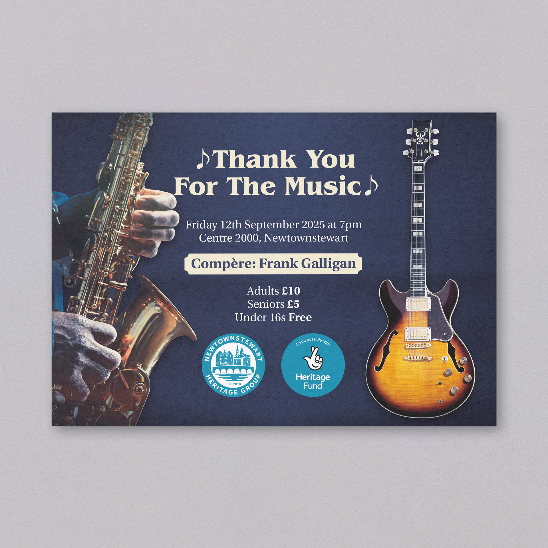 I worked with Newtownstewart Heritage Group to design and produce the concert tickets and programme Thank You For The Music!, a publication and ticket celebrating the rich cultural and musical heritage of the community. My role involved shaping the visual identity, layout, and overall narrative flow of the booklet, ensuring it reflected both the warmth of the event and the organisation’s commitment to preserving local history.