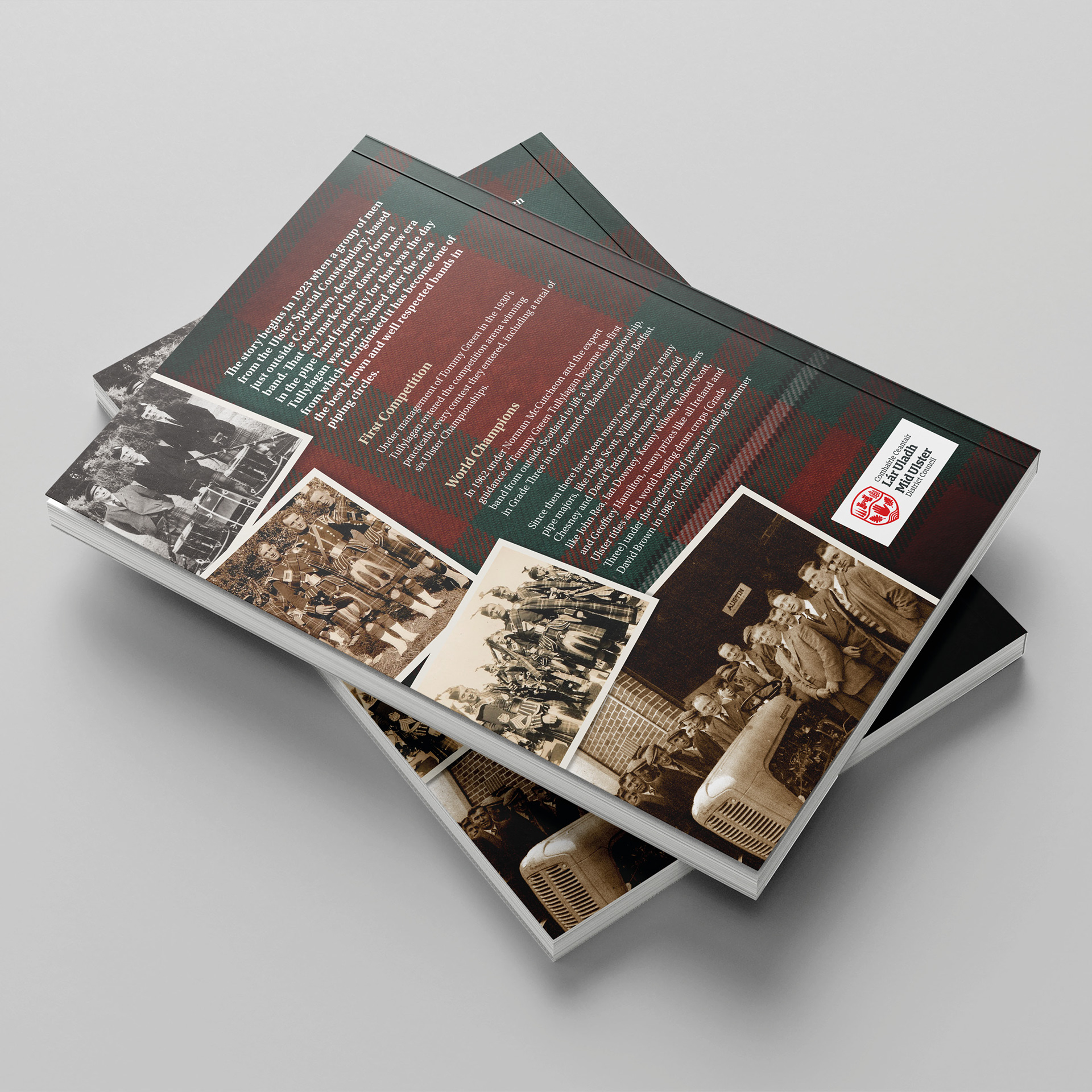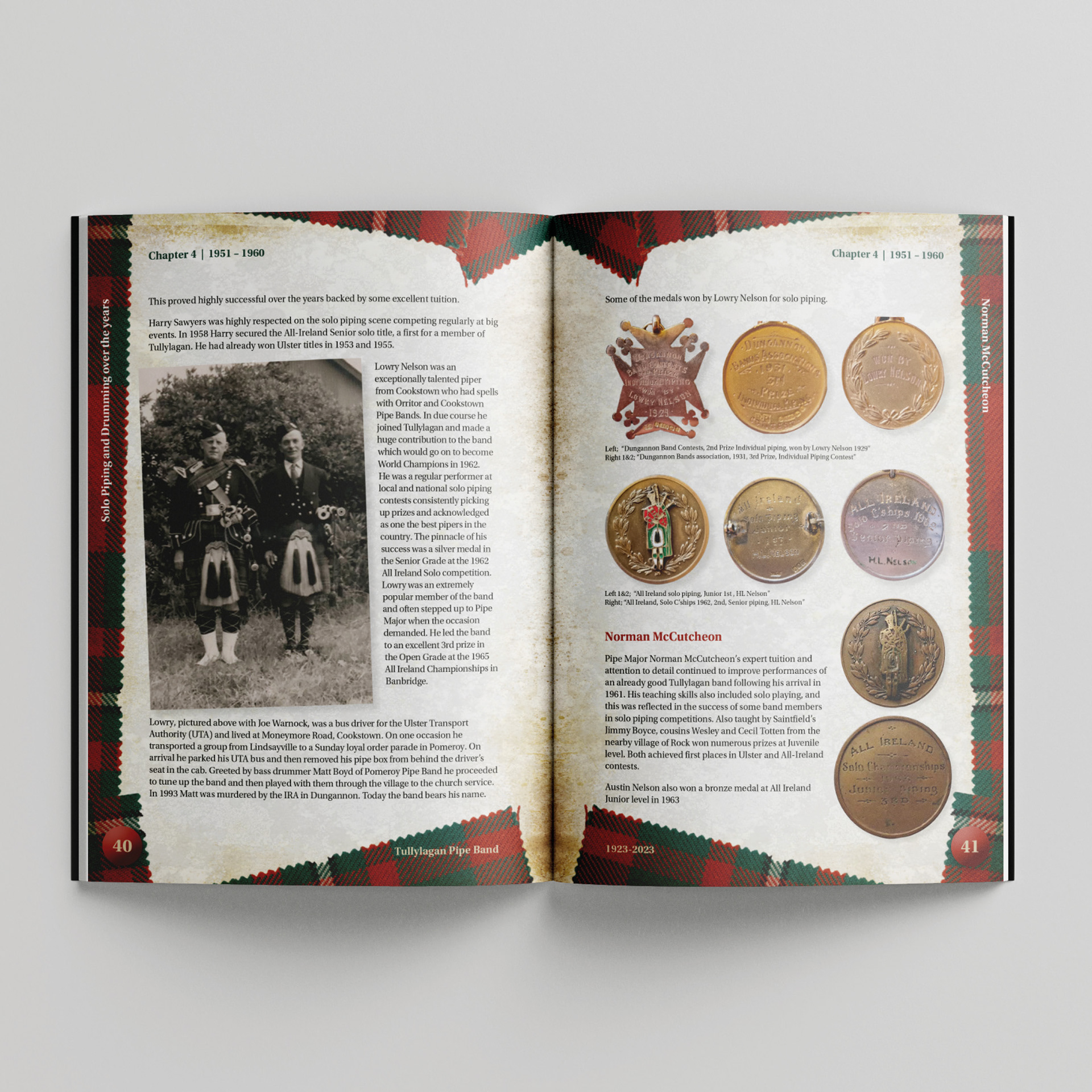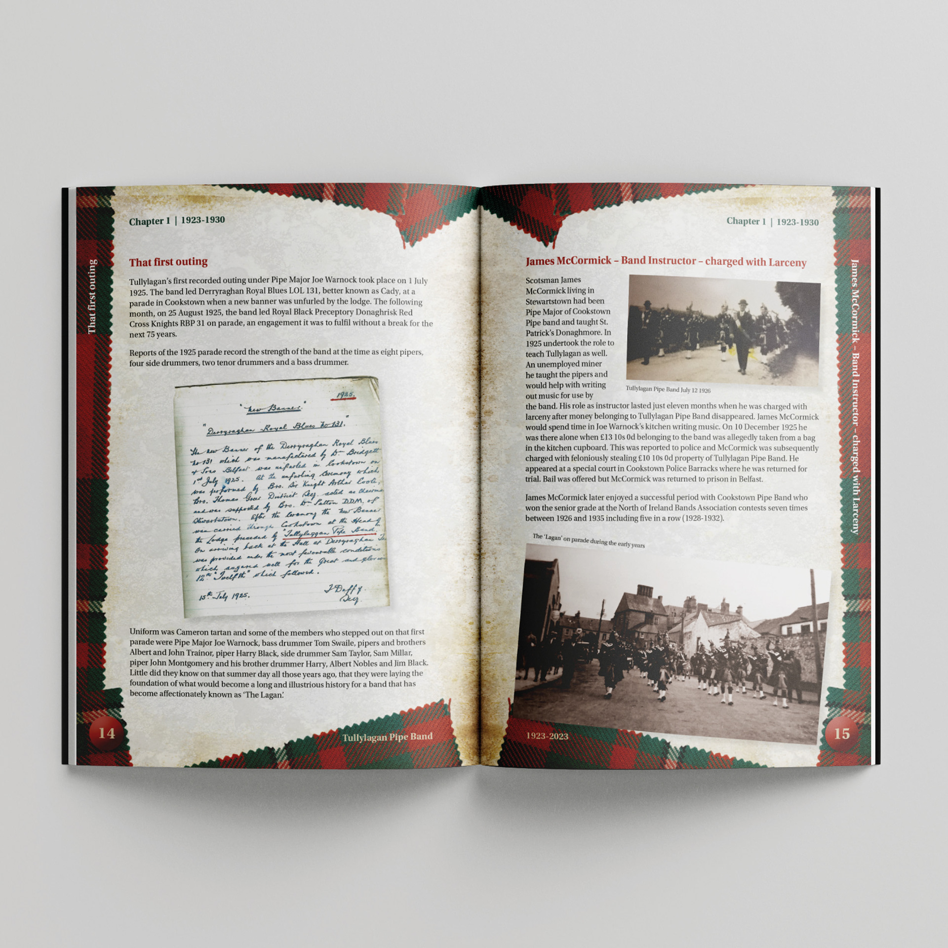 This centenary book design celebrates Tullylagan’s 100‑year journey with a clean, structured layout that honours the band’s heritage while presenting its story with modern clarity.
